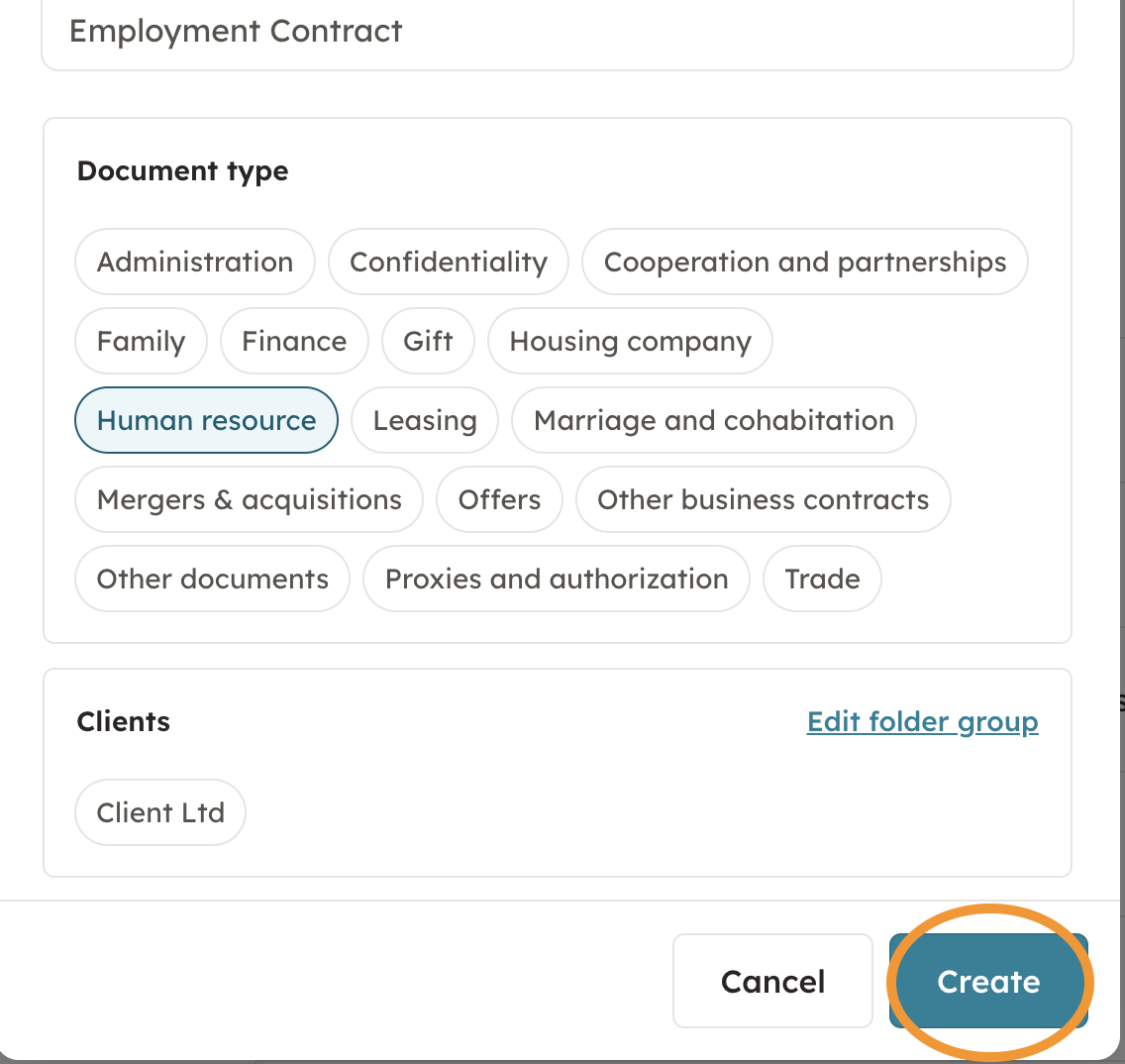 4. After pressing "Create document", choose in which folders you'd like to archive the document. Once chosen, choose "Create".