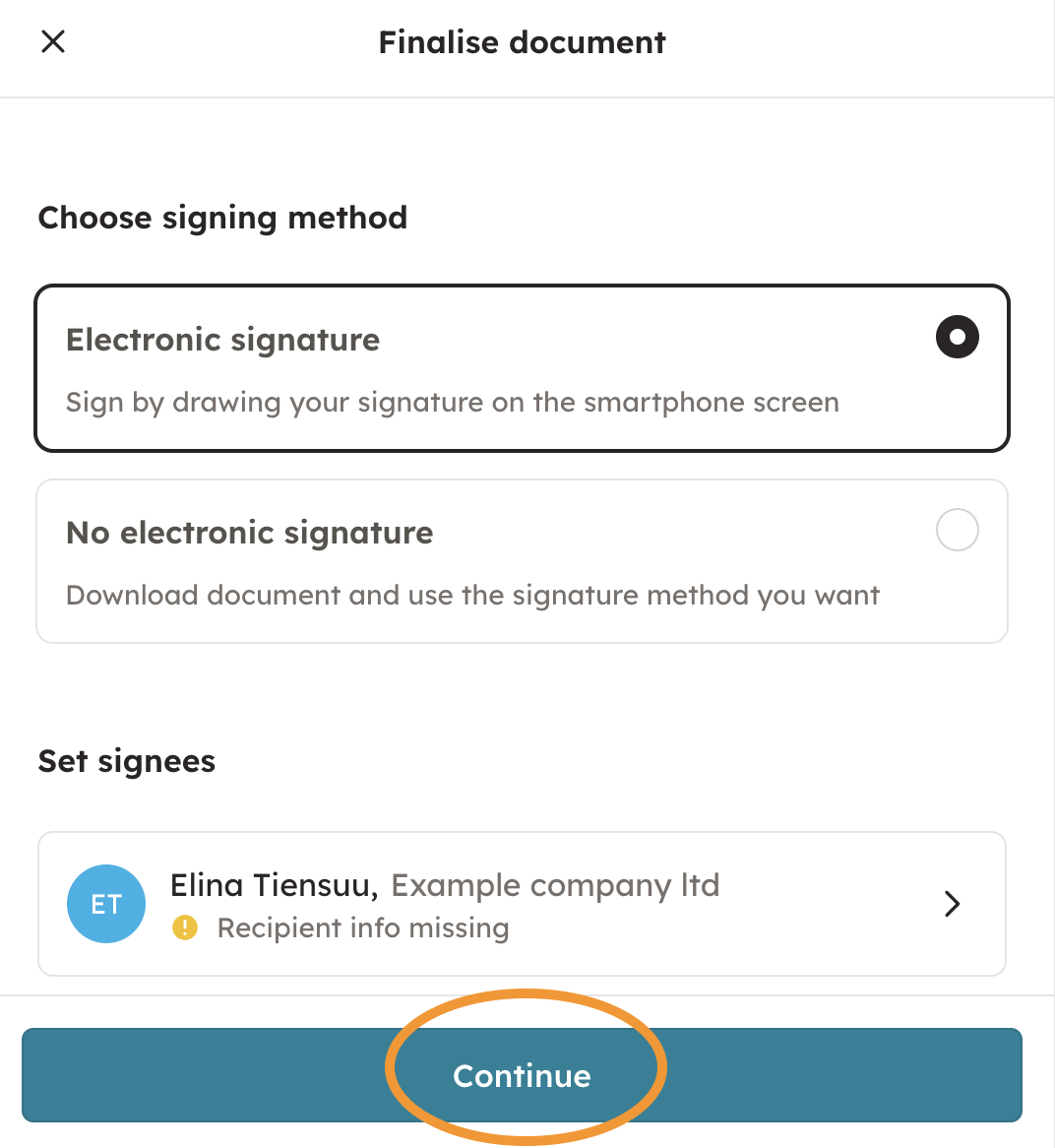 6. Choose your sign method and confirm the selection by choosing "Continue".
