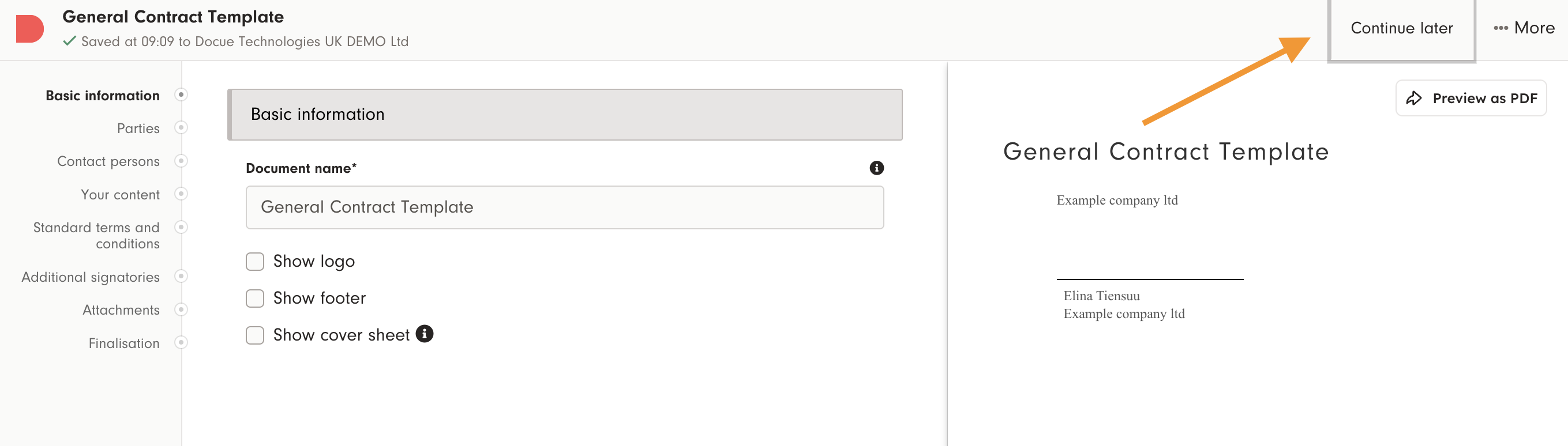 You can also finish the document at a later time by clicking "Continue later".