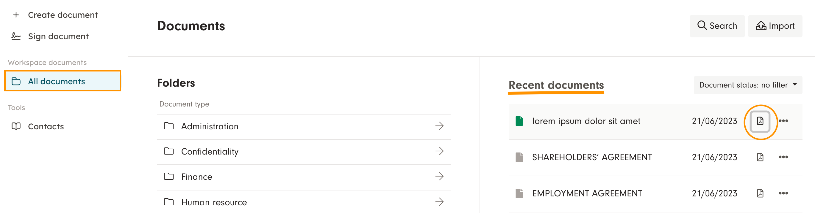 Go to "All documents" and view "recent documents" on the right side. Click on the PDF icon next to the document.