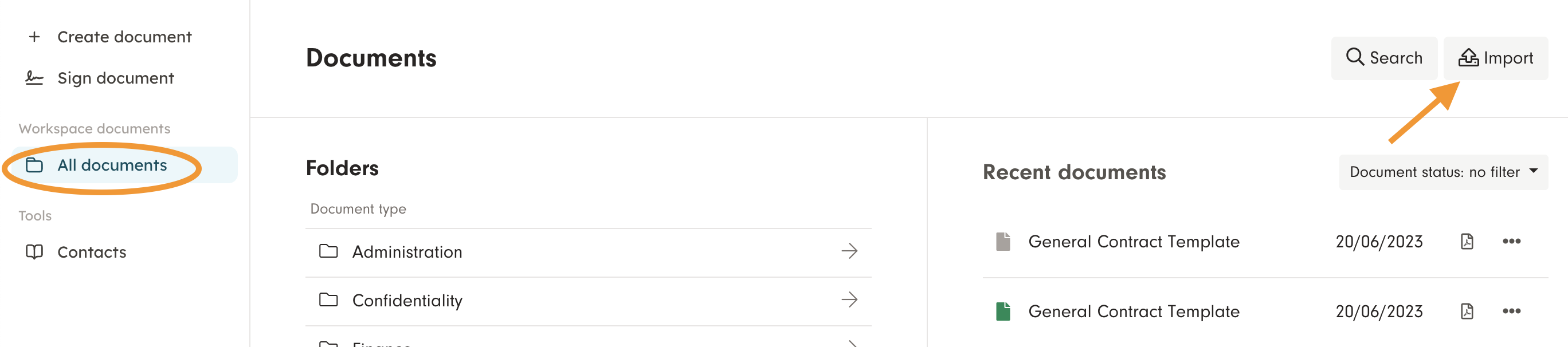 In addition to documents and contracts created in the service, you can also archive your own PDF-files to your Docue archive by clicking the "Import" button from "All Documents".