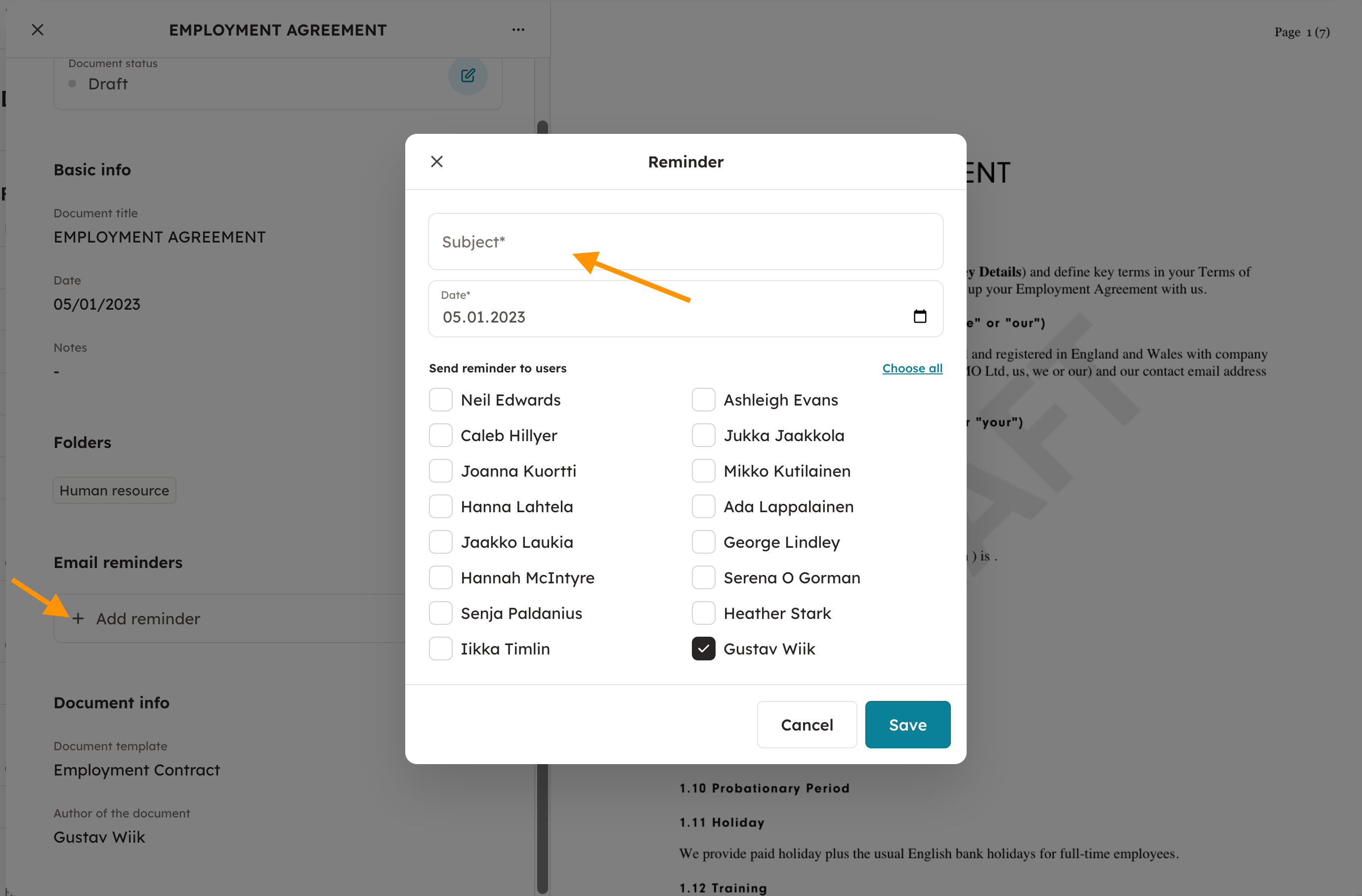 You can set reminders to the documents for situations like trials coming to an end or contracts that are about to expire. You can also write specific notes in "Email reminders". You get to add reminders by choosing the document you want from "Recent Documents" in the page "All Documents".