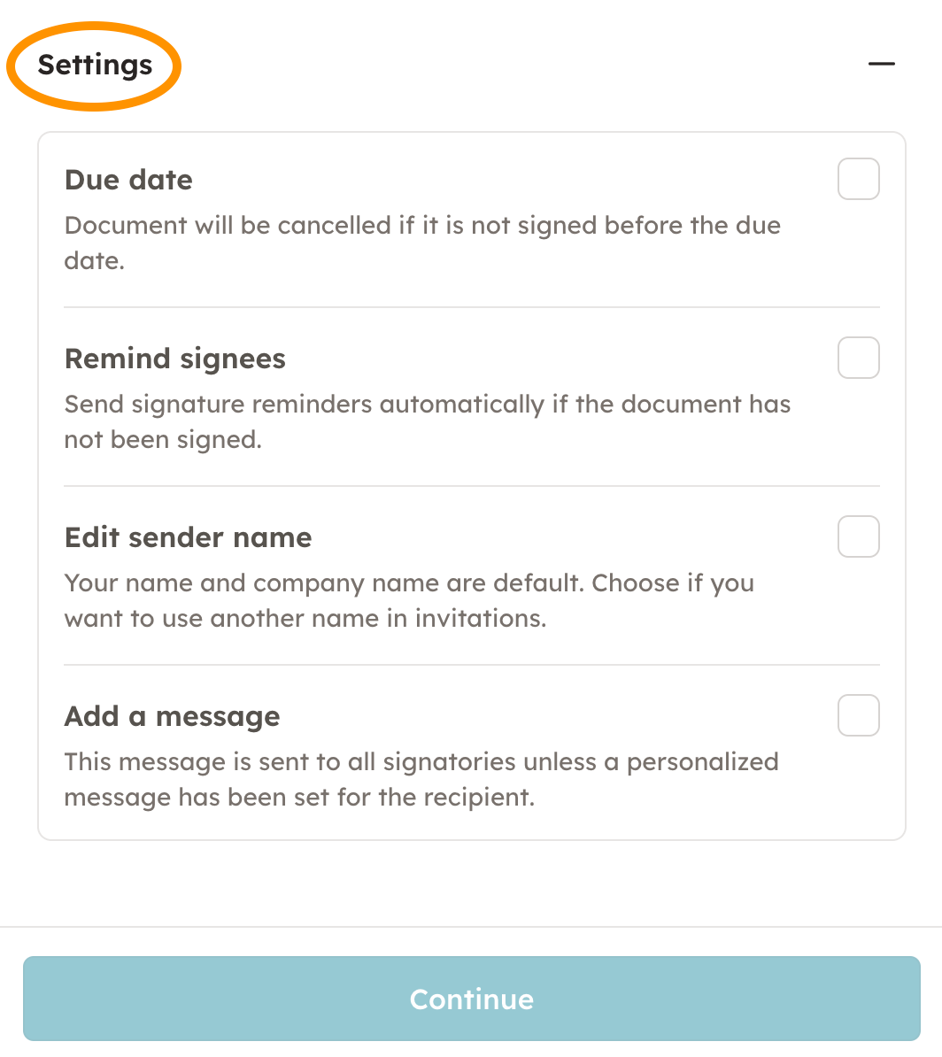 5. Through "settings" you can set a due date after which the document will be cancelled if it is not signed by all parties. You can also choose to send automatic reminders to those parties who have not signed the document yet. In addition, you are still able to edit your sender name (your name and company name) if you wish. By adding a message, signatories will receive a message, unless a personalized message has been set to them in the "add signee" section.