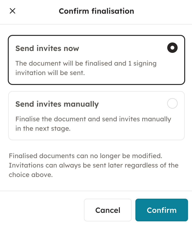 6. If you set a signing order, the platform automatically sends out the invites in the order you chose when you press continue. If you did not set a signing order, the platform asks wether you want to send out the invites automatically or manually.