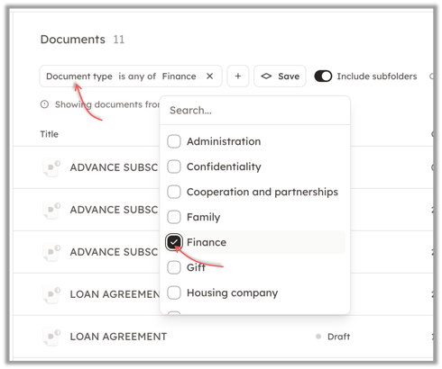 The filters are found in the top bar of the "Documents" section.