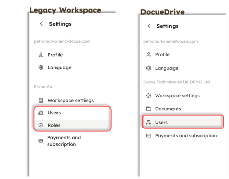 In Docue Drive, users are managed only from the "Users" menu behind the settings. This means the "Roles" menu is entirely gone compared to the legacy archive.
