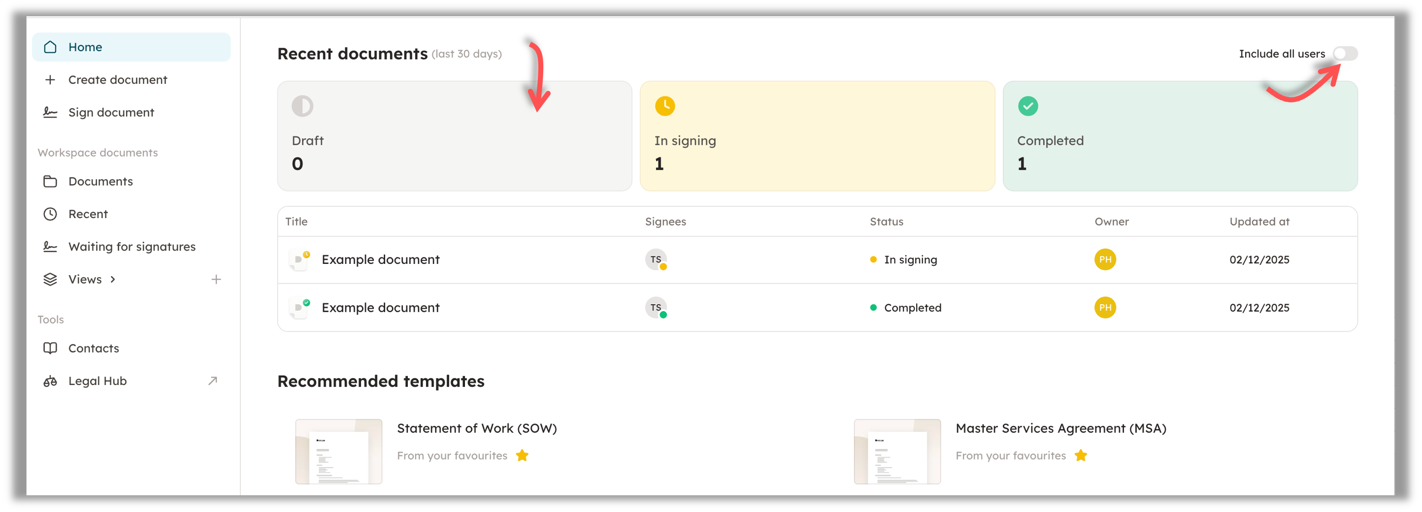 When you open the app, it will automatically open the new home page. From the home page, you are able to quickly find the documents you've started do draft or have sent to be signed.