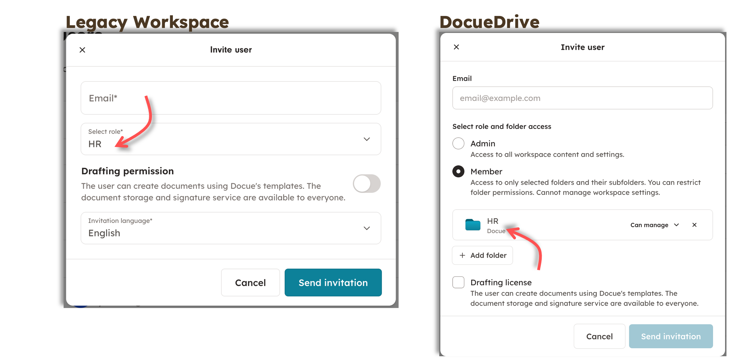 The Administrator (Admin) permission remains the same in Docue Drive as well; Admins can manage the account, subscription, and add other users. However, in Docue Drive, users with just the "Member" permission can also create subfolders within the folders they have access rights to.
