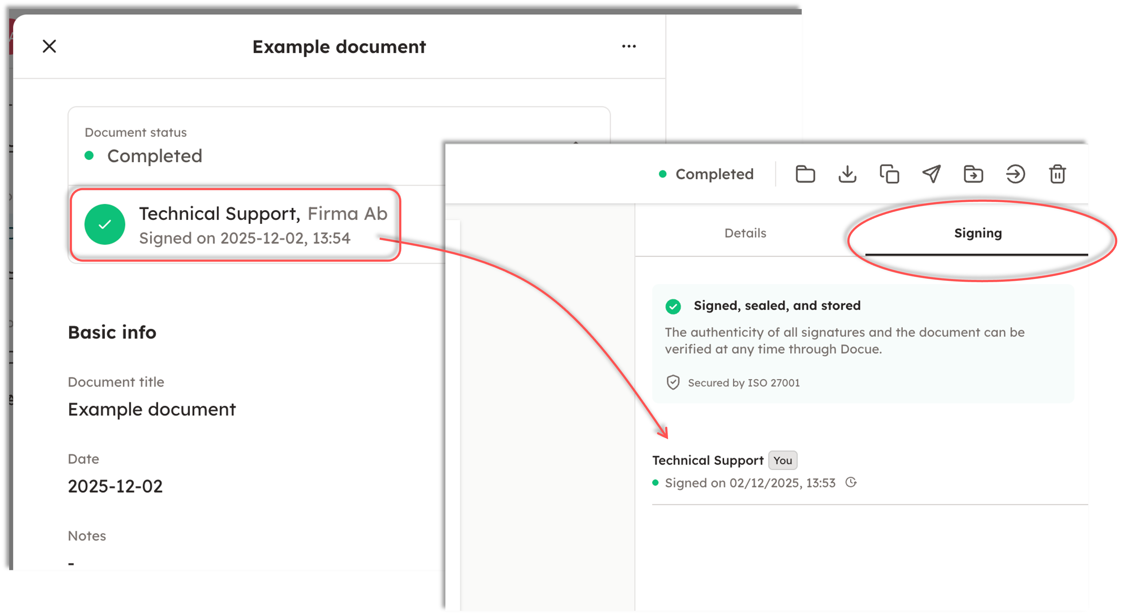 In Docue Drive, the signatory information is found on the right side of the PDF view under "Signing." From this view, you can check when the parties have signed, send signature reminders, and sign the document yourself, if you are a party to it.