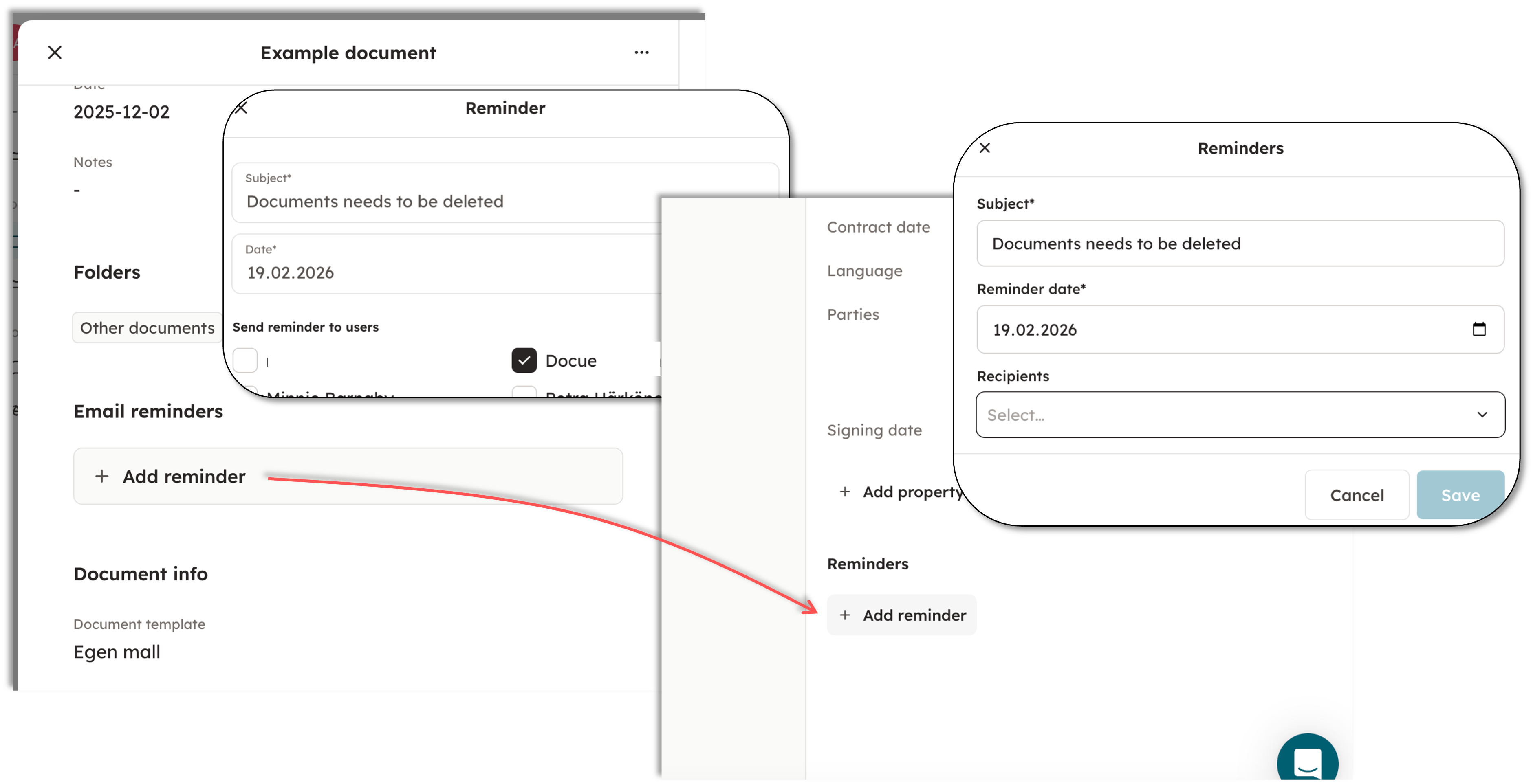 Similar to the legacy archive, you can select the desired recipients for the reminder, set the date, and the document reminder will be sent internally within the service, as well as by email.