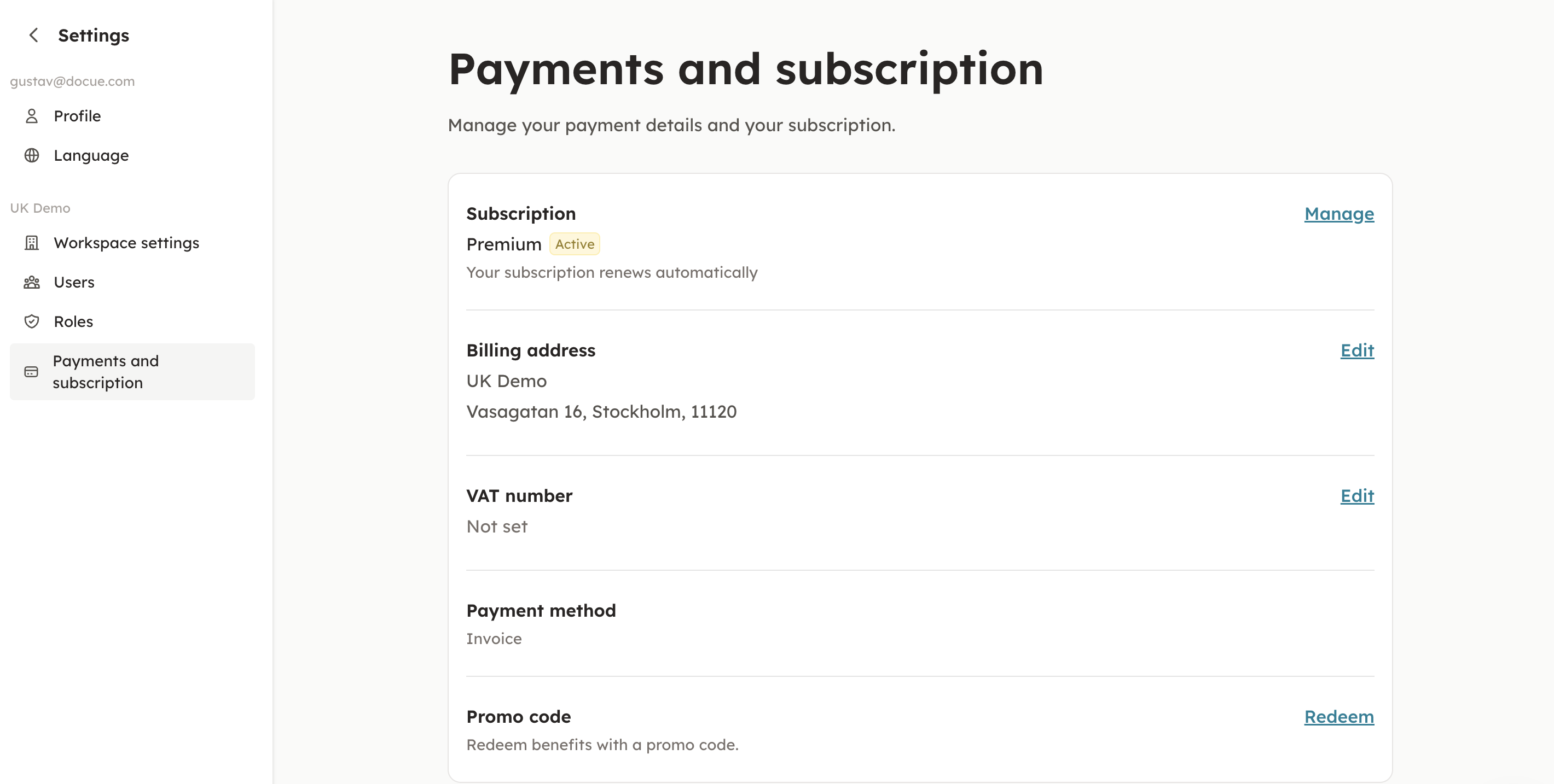 2. Go to "Settings" and then "Payments and subscription". Fill in your billing information and press save.