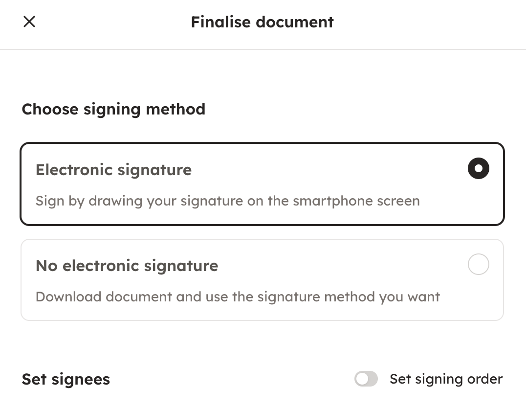 E-sign is suitable for most signing occasions. It is also the easiest way to sign. With e-sign the signee draws their signature with their finger or smart pen on their device. This signing method is equivalent to traditional signing in the UK and the EU.