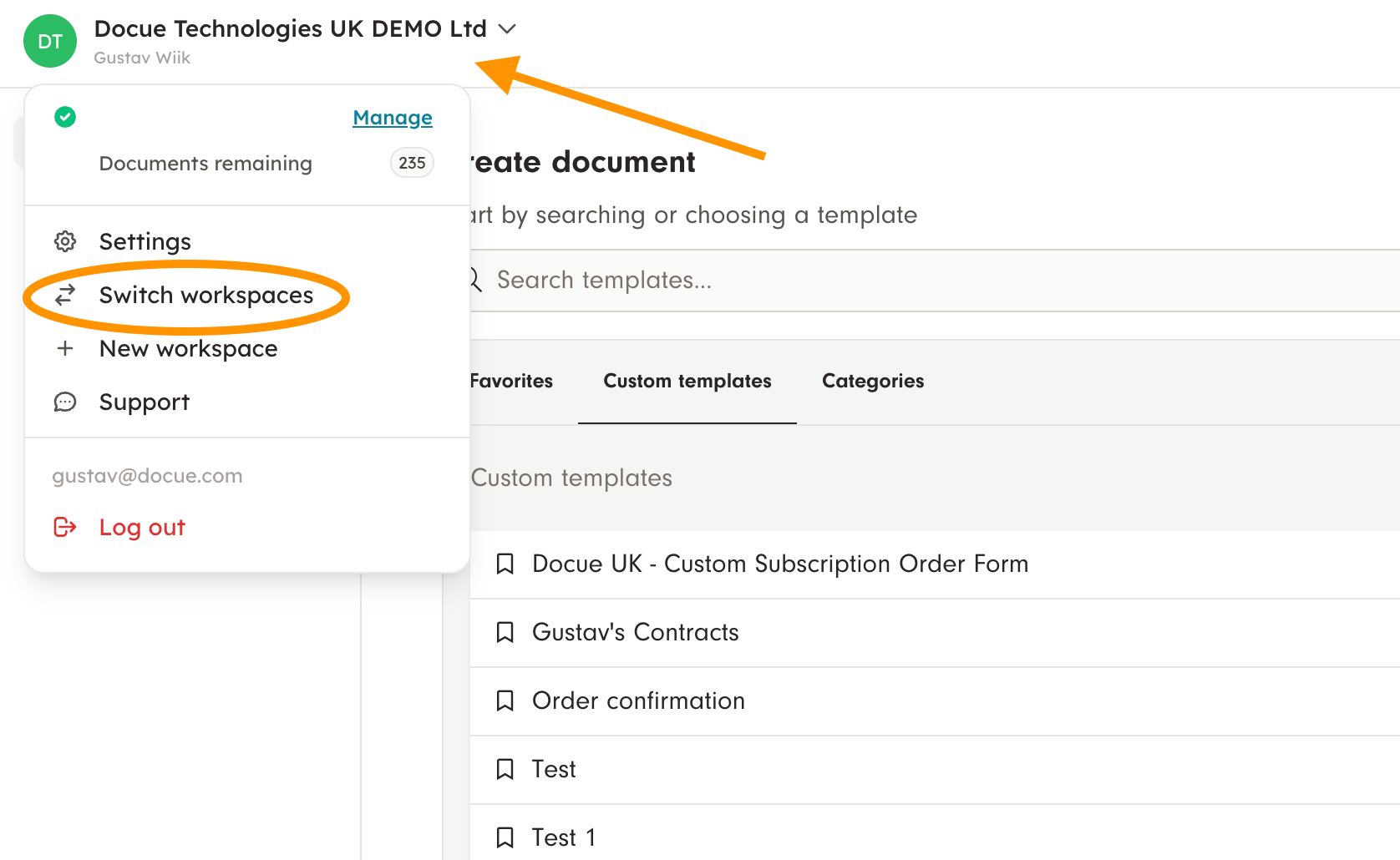 Once logged in to the service, you can change the account you wish to use by clicking your or the company name in the top left corner, and click "Switch workspaces".