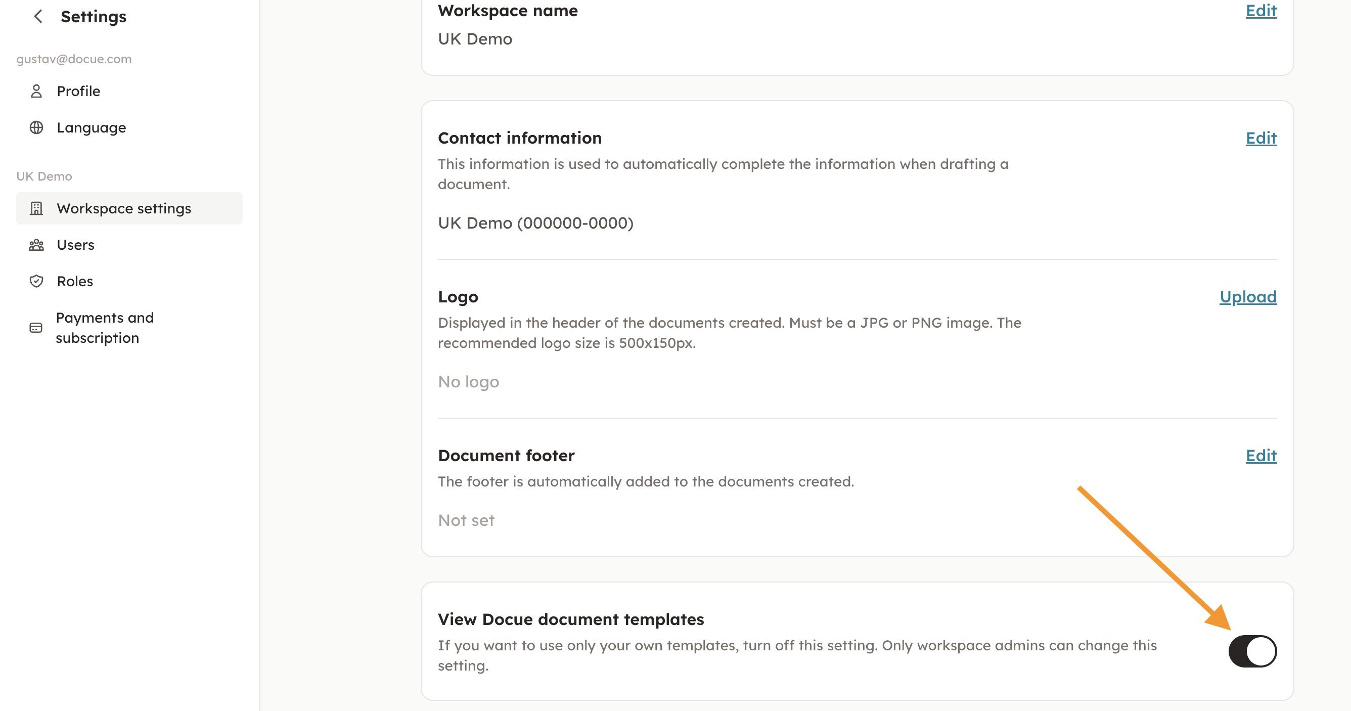 If you want, you can limit the visibility of completed documents. If you just want to use your own templates, you can disable the Docue templates in "Settings" and then "Workspace settings". In workspace settings you can turn off Docue's templates (pictured below).