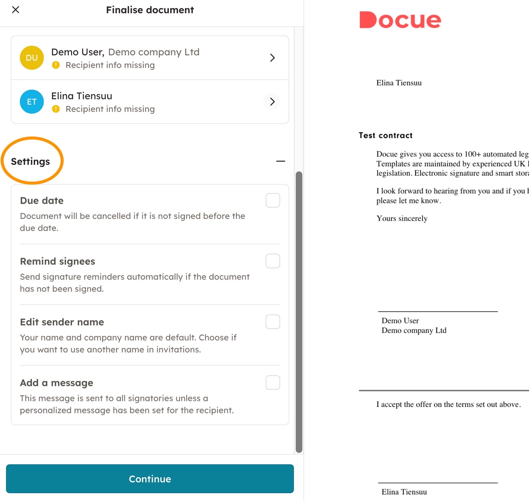 4. You can finalize your document in the "Settings" section. By setting a due date, the document will be cancelled if all parties have not signed the document before the due date. You can set automatic reminders, and remind signees if the document has not been signed.