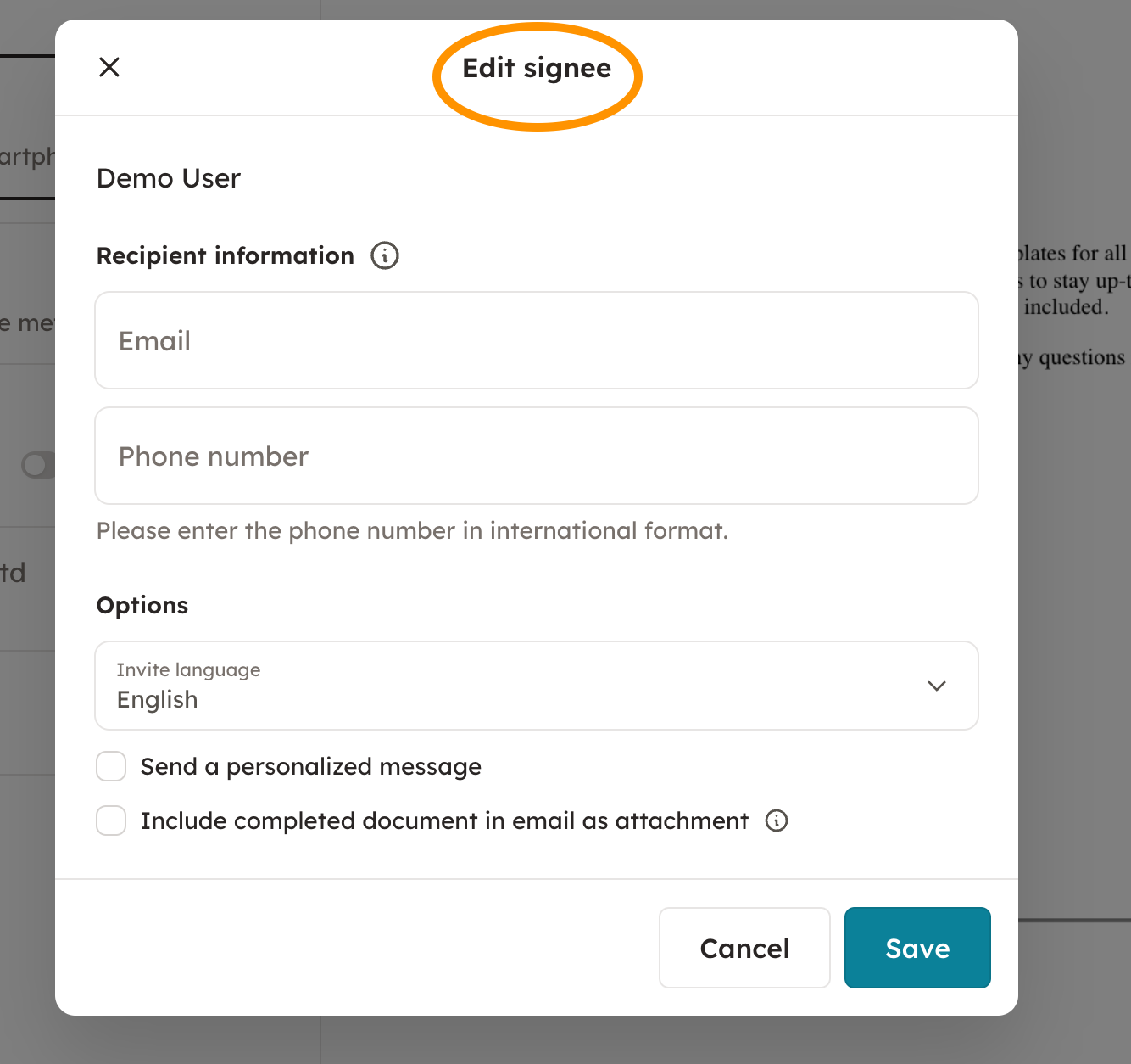 3. Once you've chosen your signature method, you can fill in additional information by clicking on the name of the signee and write a personal message if you wish. You can also choose to include the completed document in email as an attachment.