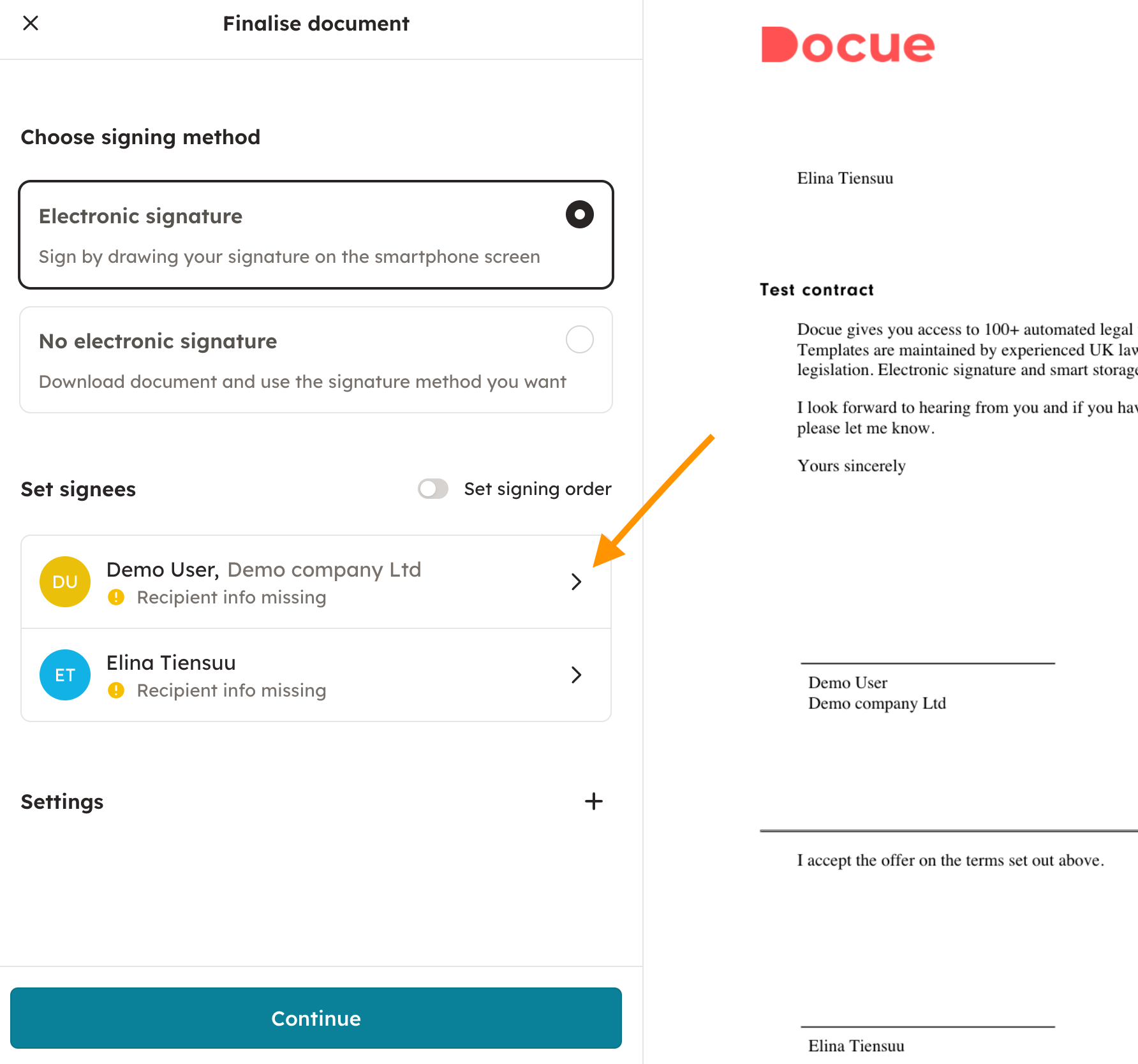 E-signing contracts created using Docue