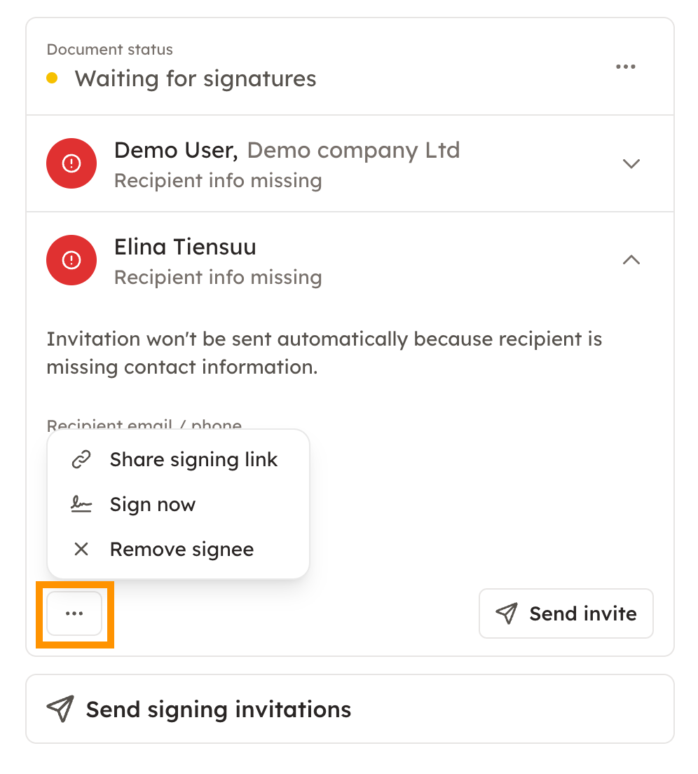6. If you chose to send out the invites manually, you can sing the document yourself first before sending it. Open information by clicking the small arrow after the name, and then choose three dots from the down left corner. You can also send the signing invitations simultaneously to everyone by clicking Send signing invitations.