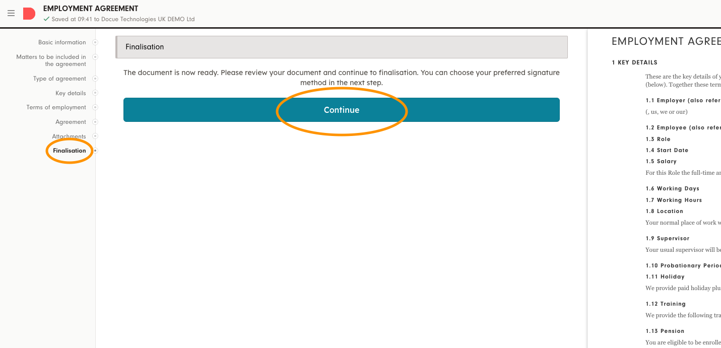1. When your document is ready to be signed, go to finalization and click on "Continue" in the middle.