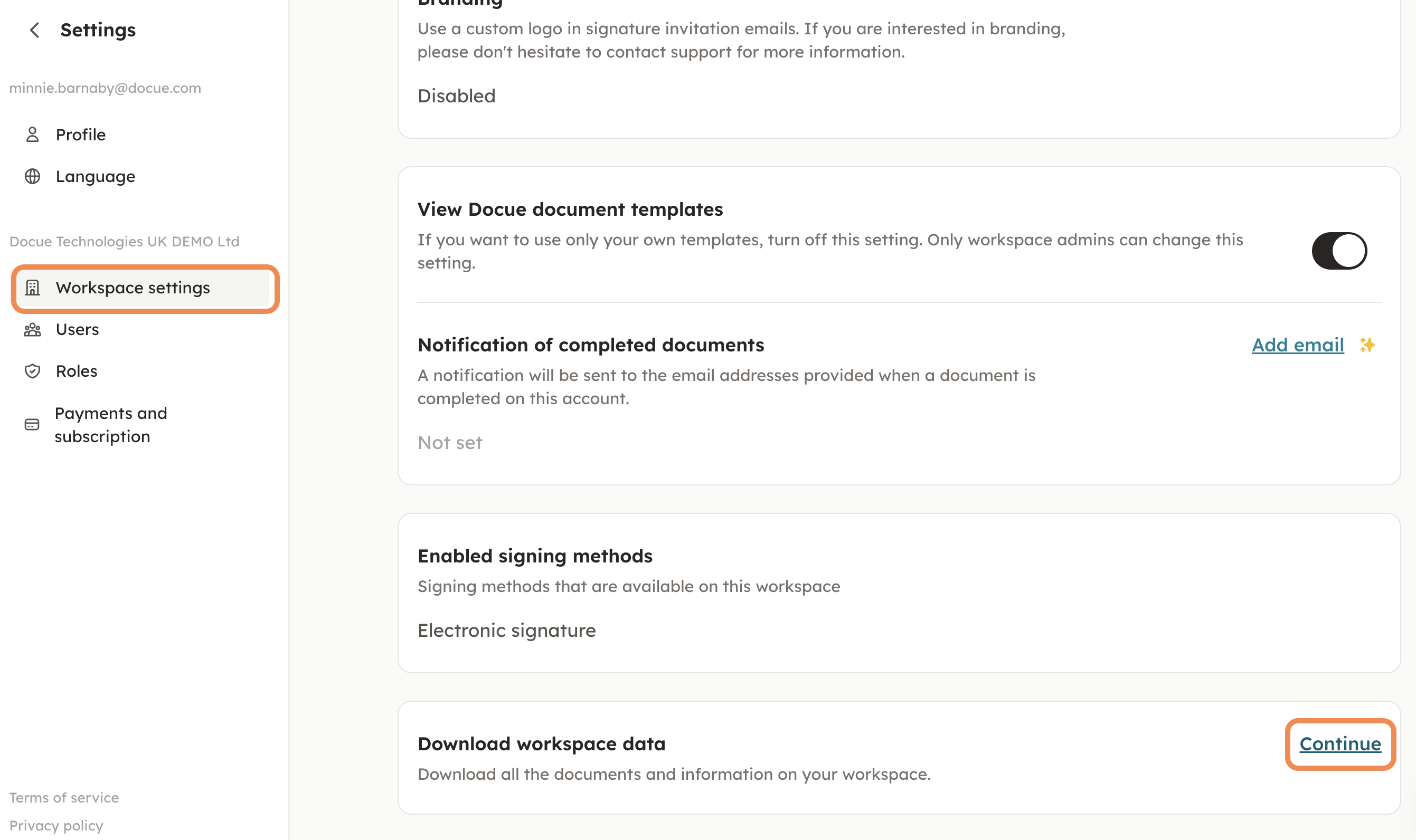 In settings, click on "workspace settings" in the left column and then scroll down to "download documents from your workspace" and then click on "continue".
