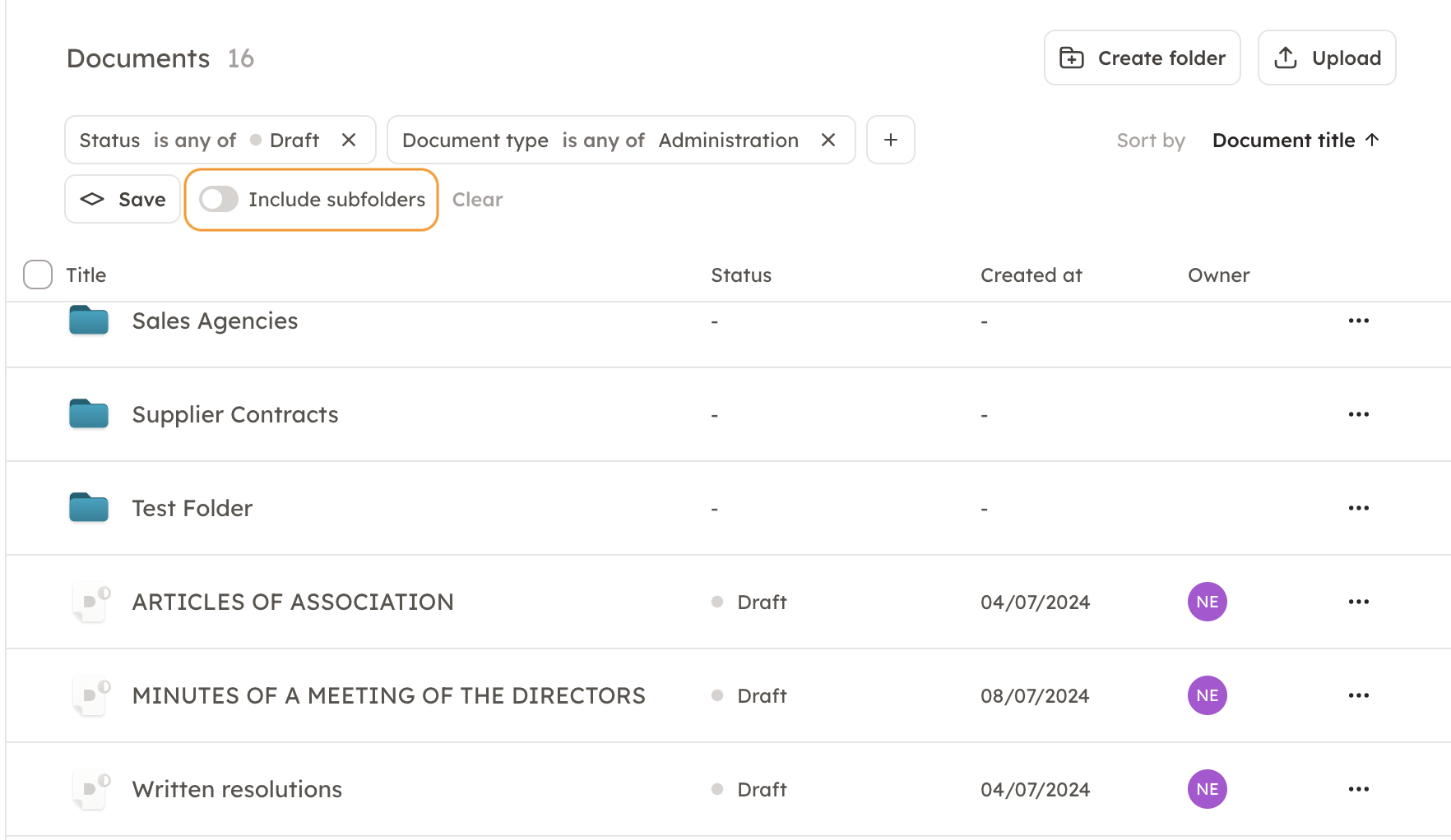 You should think whether you want to click on the "Include subfolders" button. If you do not include subfolders in the search, only documents in the main folder will be filtered. This can be a good strategy if, for example, you want to move several documents from the main folder to a specific subfolder. Then by not clicking on "Include subfolders" you can find the documents that meet the necessary conditions in the main folder.