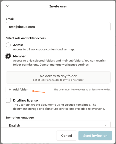 After you have selected if the invitee should be an Admin or a Member (and selected which folders the member should have access to) you can go ahead and click "Send invitation".