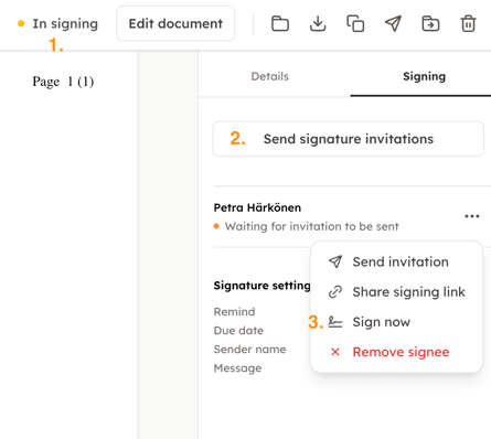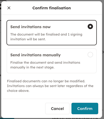 After selecting the signing method and defining the settings, you can complete the document by choosing whether to send the invitations immediately or manually in the next step. Even if you choose to send the invitations automatically, you can send the signature invitations again later if needed.