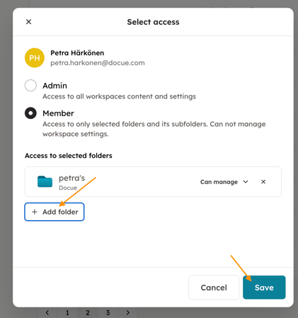 When selecting permissions, you will see which folders the user has access to. You can uncheck a folder and add folders from the +Add folder section. Remember to save your changes when you are finished.