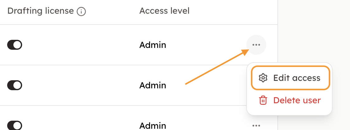 Permission settingsPermissions can be set either when inviting a user to the account or later from the Settings menu under Users. To start setting permissions, either go to the Invite user-section or select the three dots next to the name of a user on the account and "Edit access".