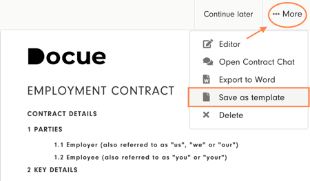 When you have filled in the necessary fields, do not continue to finalise the document. Instead click on "More" in the top right corner of the drafting view and select "Save as template" from the drop-down menu.