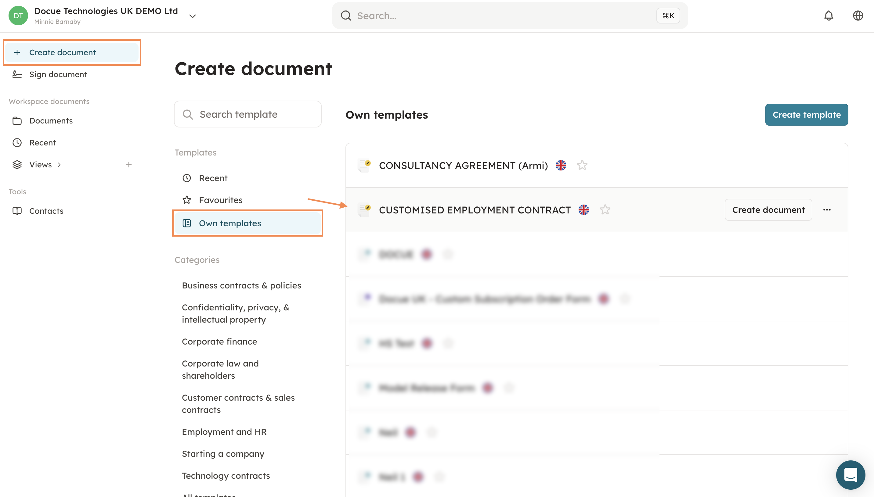 With Docue it's possible to save self-filled document templates to your Docue account, essentially creating your own customised templates. Pre-filled document templates make it easier and faster to draft contracts in situations where only a small amount of information changes each time it's drafted.