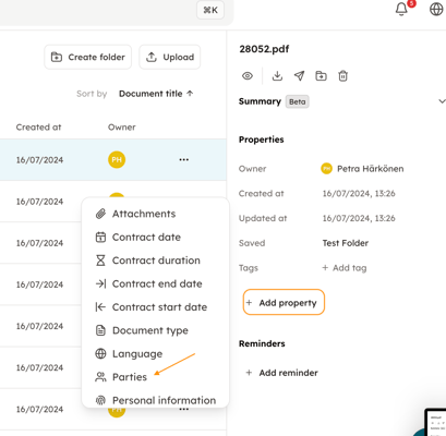 4. After uploading a document, you can add metadata, so that your contract management is easier. Just open the document and click on "+ Add property". This way you can add important information, such as the parties to the contract. When you upload a document, it will automatically contain only information about the date the document was uploaded and the person who uploaded it.