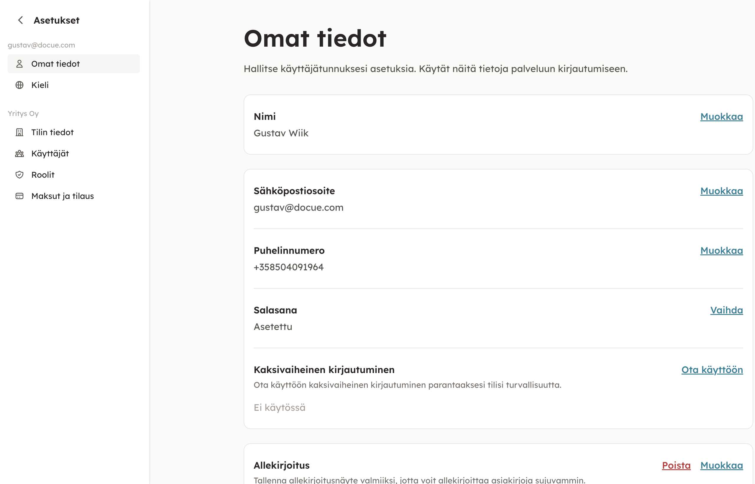 Asetusten kautta voit vaihtaa käyttöliittymän kielen, yhteystietosi, maksukorttisi, salasanasi ja allekirjoitusnäytteesi. Sen lisäksi voit ottaa kaksivaiheisen kirjautumisen käyttöön tai pois päältä.