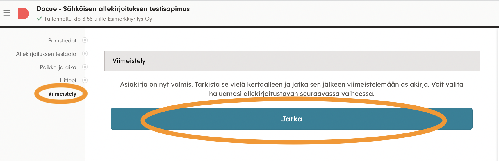 1. Kun laatimasi asiakirja on allekirjoituksia vaille valmis, viimeistele se painamalla laatimisnäkymän lopusta löytyvää "Jatka"-painiketta.