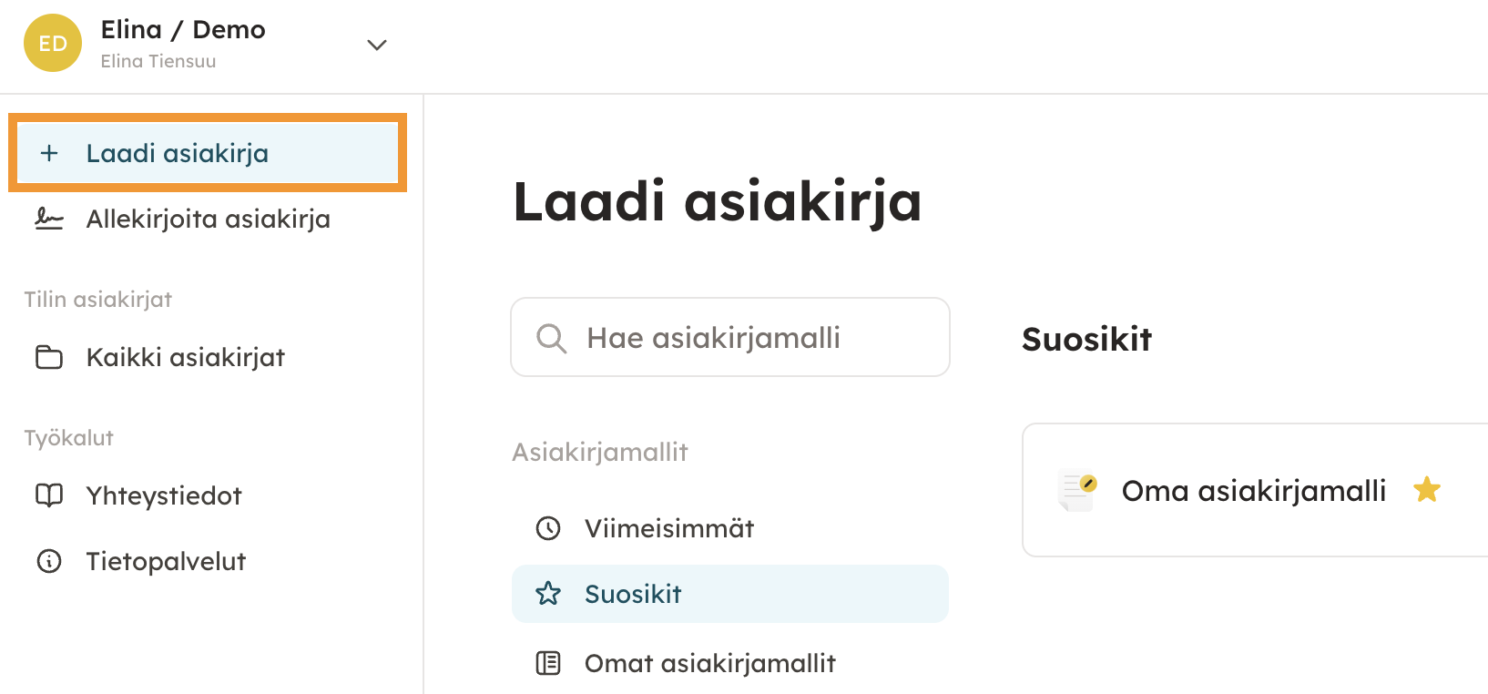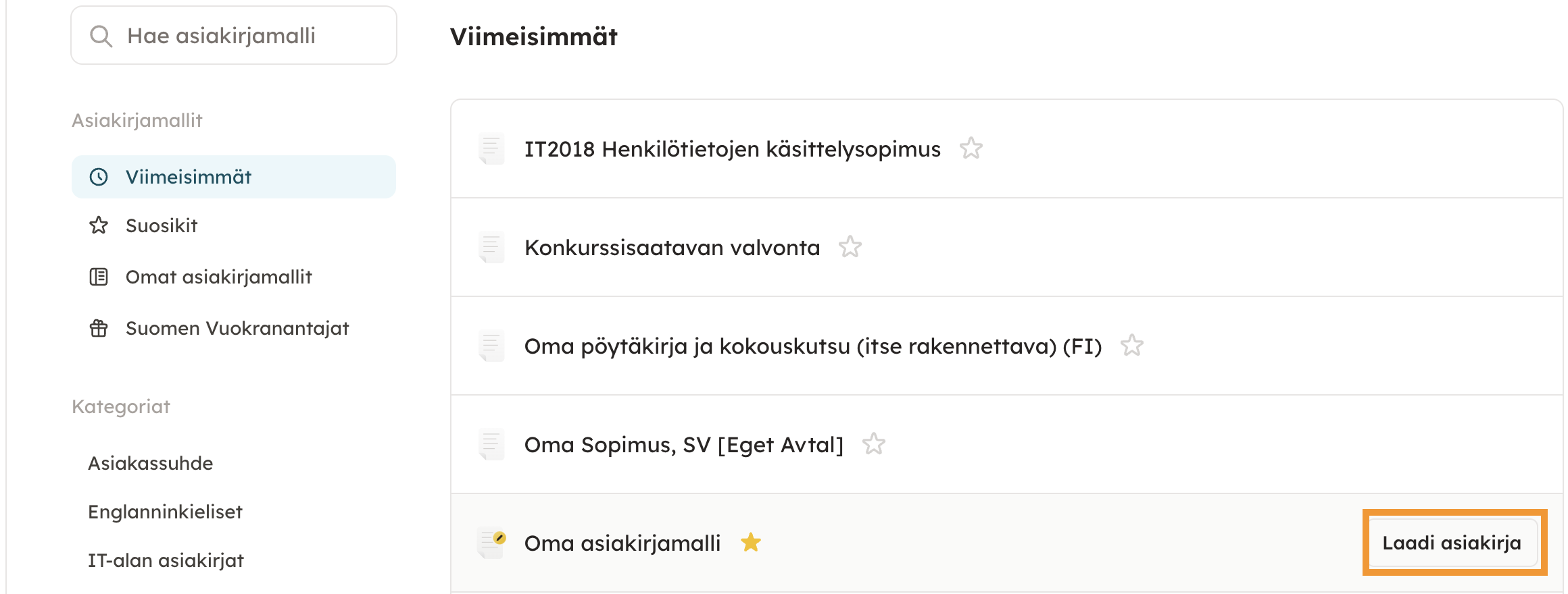 1. Siirry sivupalkista kohtaan ”Laadi asiakirja”. Voit hakea palvelun asiakirjamalleja haun kautta tai selata malleja kategorioittain. Omat mallit -osiosta löydät mahdolliset yrityksenne omat asiakirjamallit. Valitse haluamasi asiakirjamalli klikkaamalla sen nimeä.