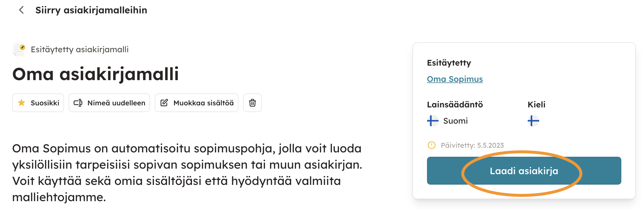 2. Jos tarvitset lisätietoa asiakirjamallista, klikkaa mallin nimeä niin pääset kattavalle info-sivulle. Aloita laatiminen valitsemalla "Laadi asiakirja".