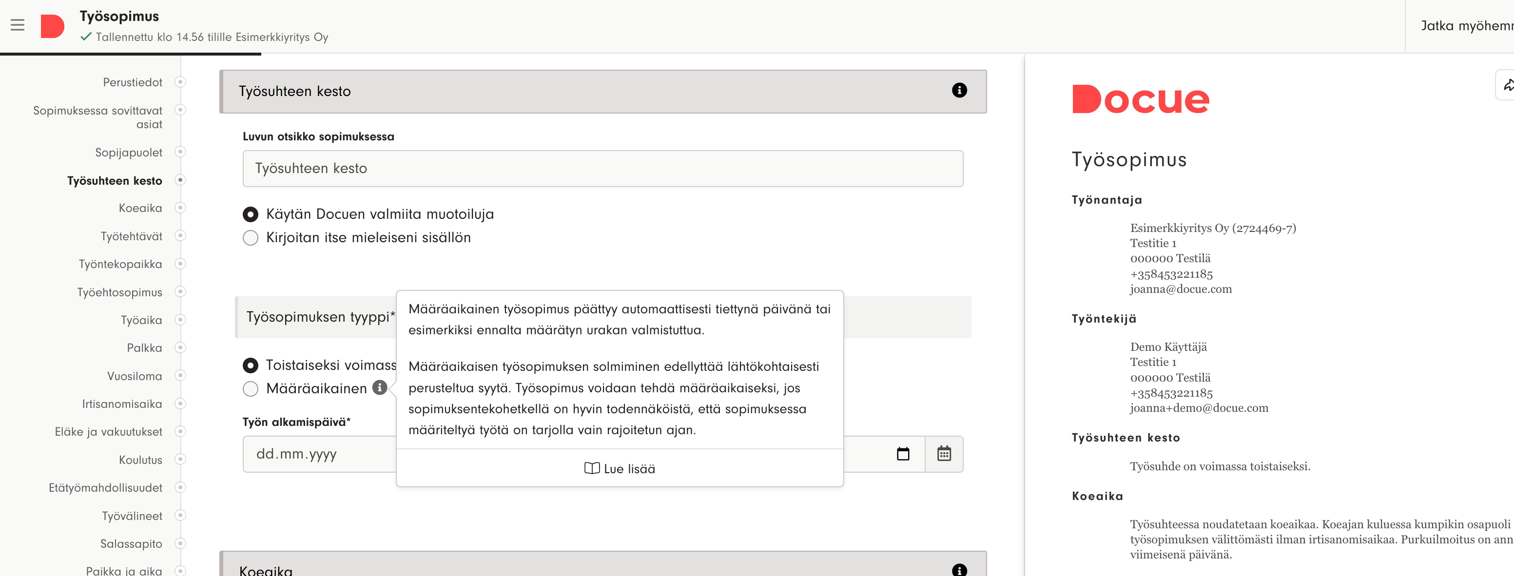 3. Laadi asiakirja palvelun pikavalintojen, täytettävien kenttien ja ohjeiden avulla. Palvelu tallentaa kaikki tekemäsi muutokset reaaliaikaisesti, eli tarvittaessa voit huoleti keskeyttää laatimisen koska tahansa ja palata myöhemmin jatkamaan siitä mihin jäit.