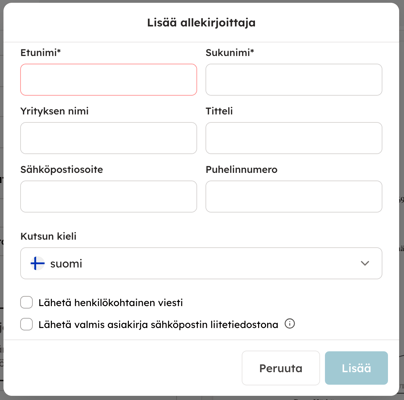 Asiakirjan tuotuasi voit halutessasi muuttaa sen nimeä, määrittää sen kielen (asiakirjan kieli toimii allekirjoituskutsujen oletuskielenä) sekä valita kansiot, joihin se kansioidaan. "Lisää tiedosto" -painikkeesta voit lisätä myös muita tiedostoja allekirjoitettavan asiakirjan liitteeksi. Tiedostojen yhteiskoon tulee olla maksimissaan 13MB.