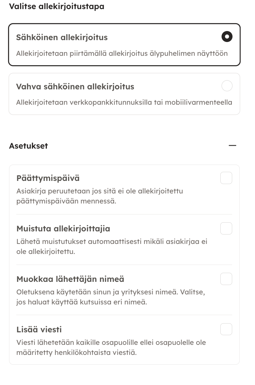 Valitse allekirjoitustapa (lisätietoa eri allekirjoitustavoista). Asetusten kautta voit valita päättymispäivämäärän mikäli asiakirjaa ei ole allekirjoitettu siihen mennessä. Voit myös halutessasi lähettää automaattisia muistutusviestejä. Tarvittaessa voit muokata kutsuissa näkyvän lähettäjän tietoja sekä asettaa yhteisen viestin, joka näkyy kutsun yhteydessä kaikille niille osapuolille, joille ei ole asetettu henkilökohtaista saateviestiä. Siirry eteenpäin "Jatka"-painikkeesta ja vahvista asiakirjan viimeistely.