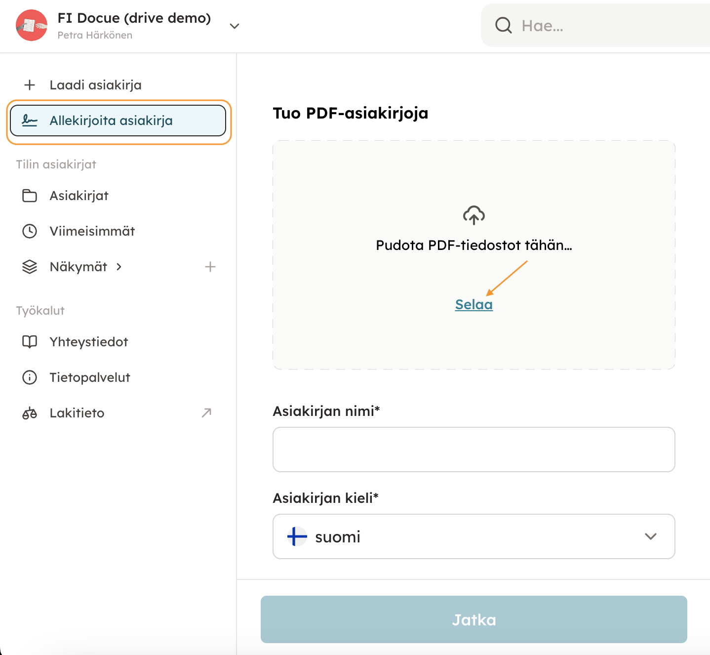 Tuo allekirjoitettava PDF-asiakirja laitteeltasi palveluun ”Selaa”-painikkeella tai raahaamalla.