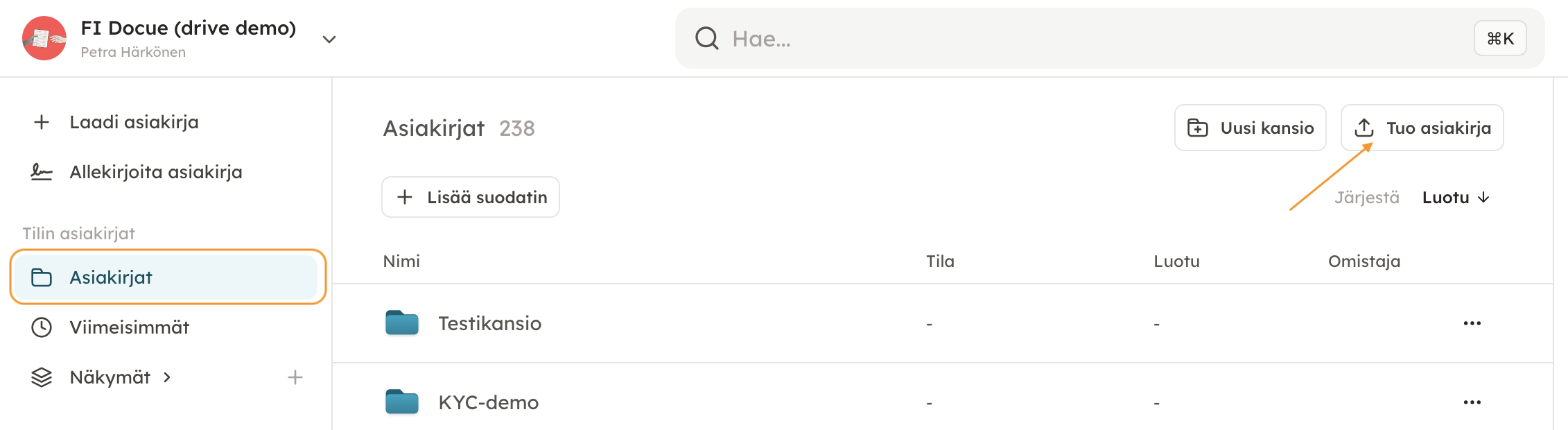 Saat tuotua oman PDF-tiedostosi palveluun menemällä kohtaan "Asiakirjat" ja klikkaamalla kohtaa "Tuo asiakirja".