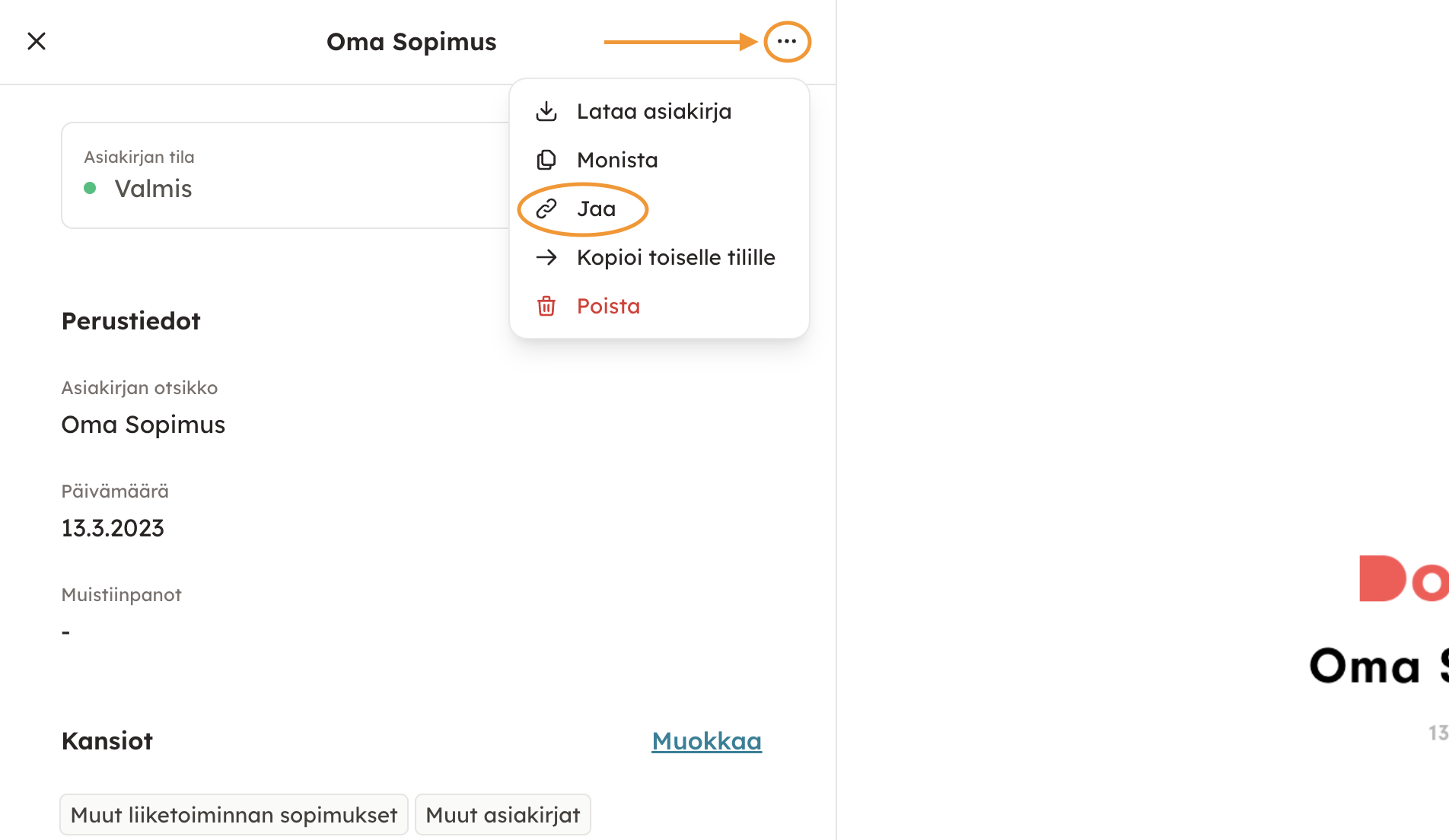 Asiakirjat -osiossa (arkistossa) olevan asiakirjan voi lähettää sähköpostin liitteenä tai linkkinä klikkaamalla asiakirjan nimeä ja valitsemalla "Jaa" (toiminto löytyy kolmen pisteen takaa).