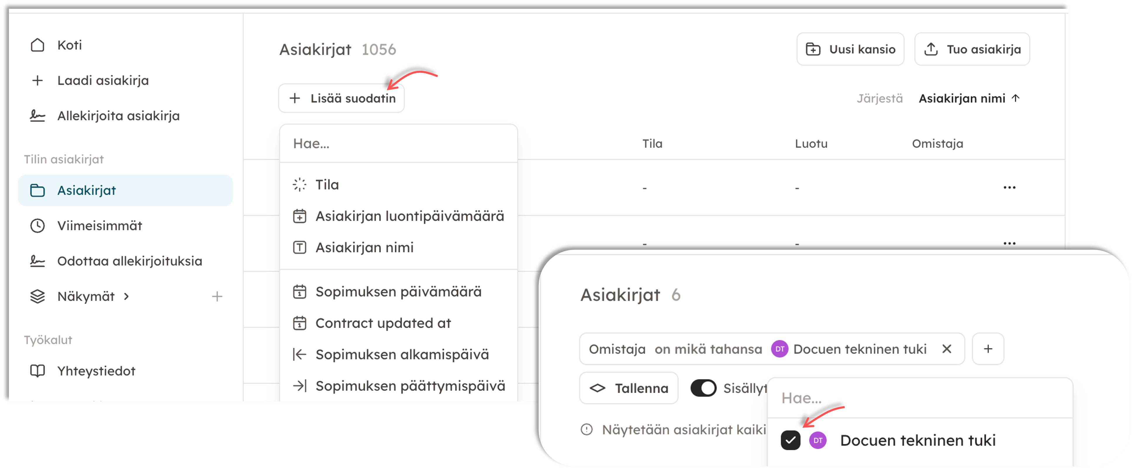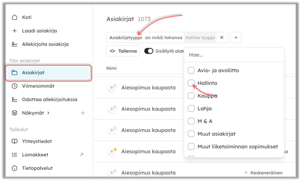 Pystyt suodattamaan asiakirjoja mm. asiakirjan omistajan (laatijan), asiakirjan osapuolten, allekirjoituspäivämäärän tai nimen perusteella.