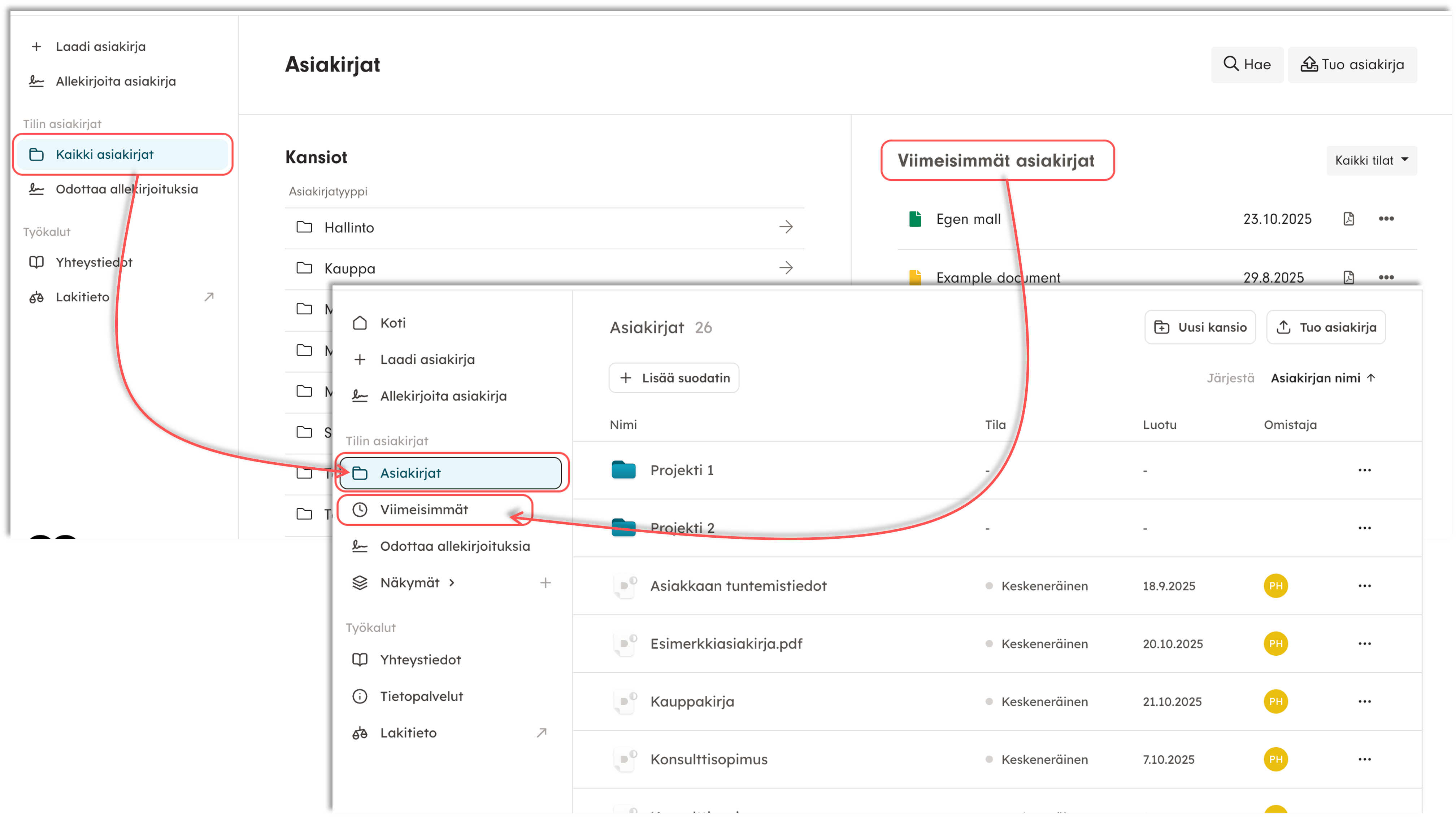 Kaikki Docue-tilillä laaditut asiakirjat tallentuvat DocueDrivessa "Asiakirjat" valikon alle. Sivuvalikosta löytyy myös "Viimeisimmät" osio, josta pääset näkemään tilillä laadittuja viimeisimpiä asiakirjoja.