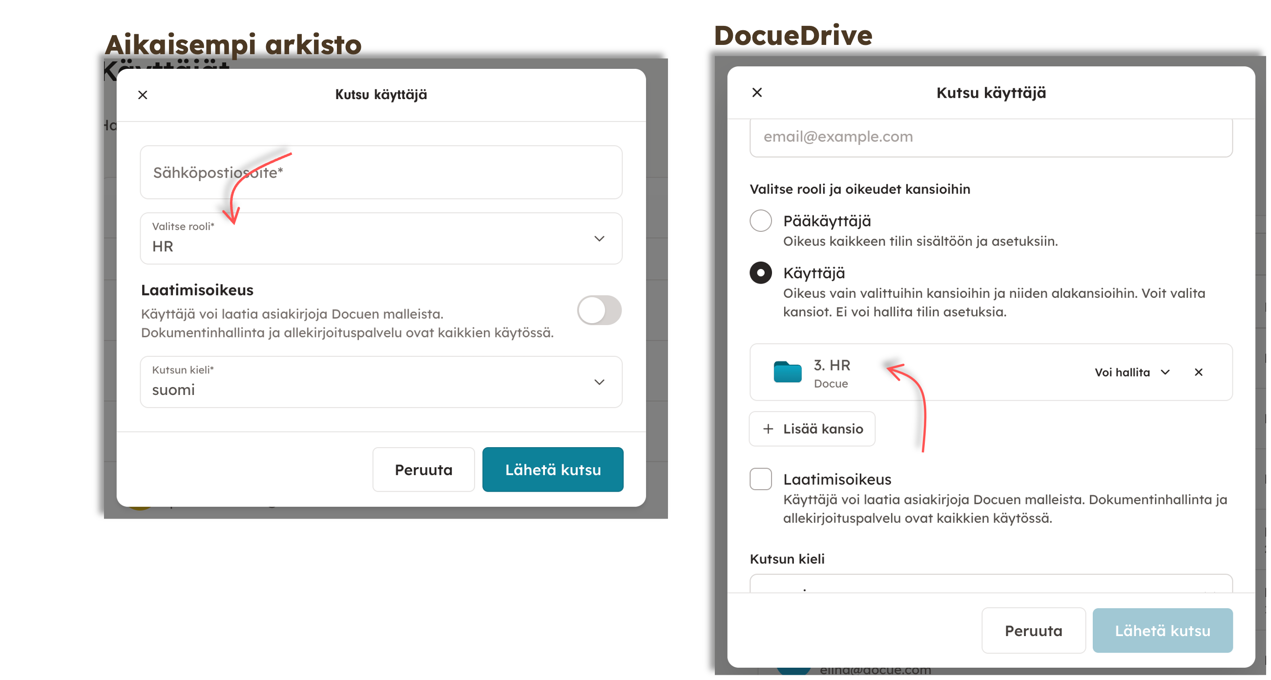 Käyttäjille pystyy DocueDrivessa määrittelemään oikeudet kansiokohtaisesti, eli enää ei tarvitse erikseen määritellä Roolia ja tätä asettaa käyttäjälle käyttäjät-valikossa, kuten vanhassa arkistossa.