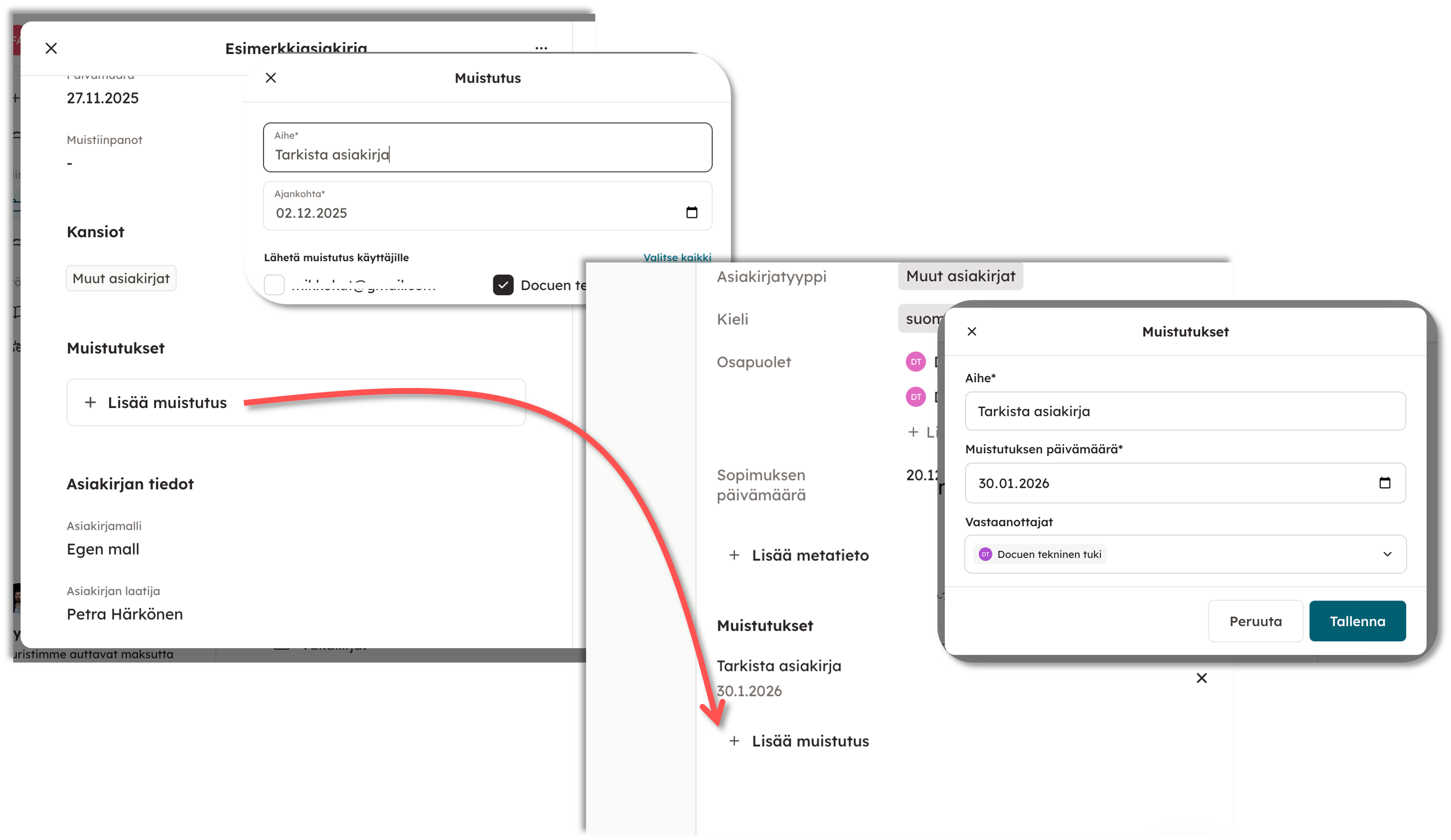 Samalla tavalla kuin aikaisemmassa arkistossa, pystyt valitsemaan haluamasi henkilöt, joille muistutus lähtee, asettamaan päivän, ja näin muistutus asiakirjasta lähtee palvelun sisäisesti, sekä sähköpostilla.