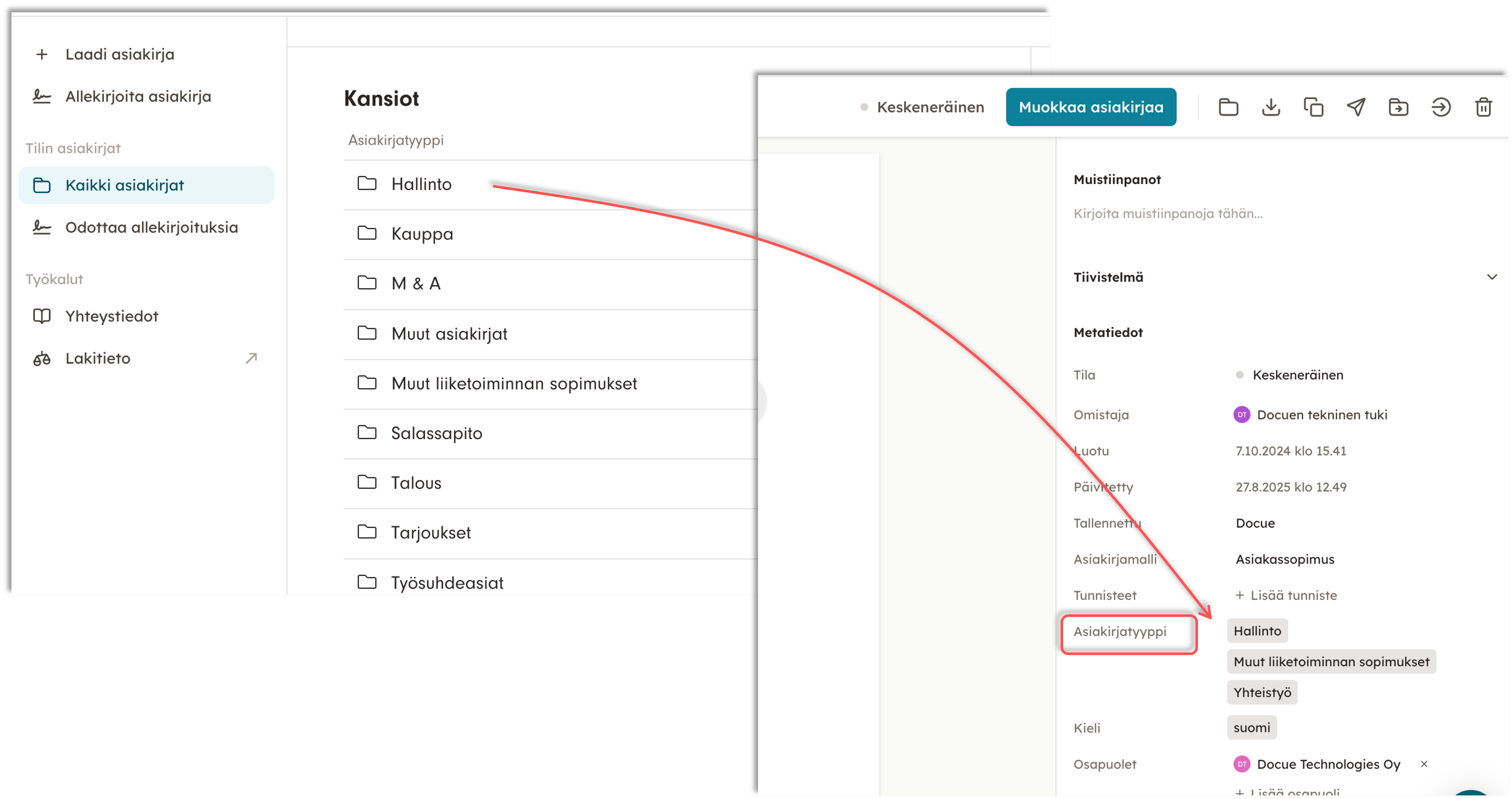 DocueDrive-siirron yhteydessä "Asiakirjatyyppi" kansiota ei ole enää, vaan kyseinen tieto on siirtynyt asiakirjan Metatietoihin. Kun klikkaat asiakirjan auki, pääset näkemään asiakirjan metatiedot, joista yksi on juurikin Asiakirjatyyppi.