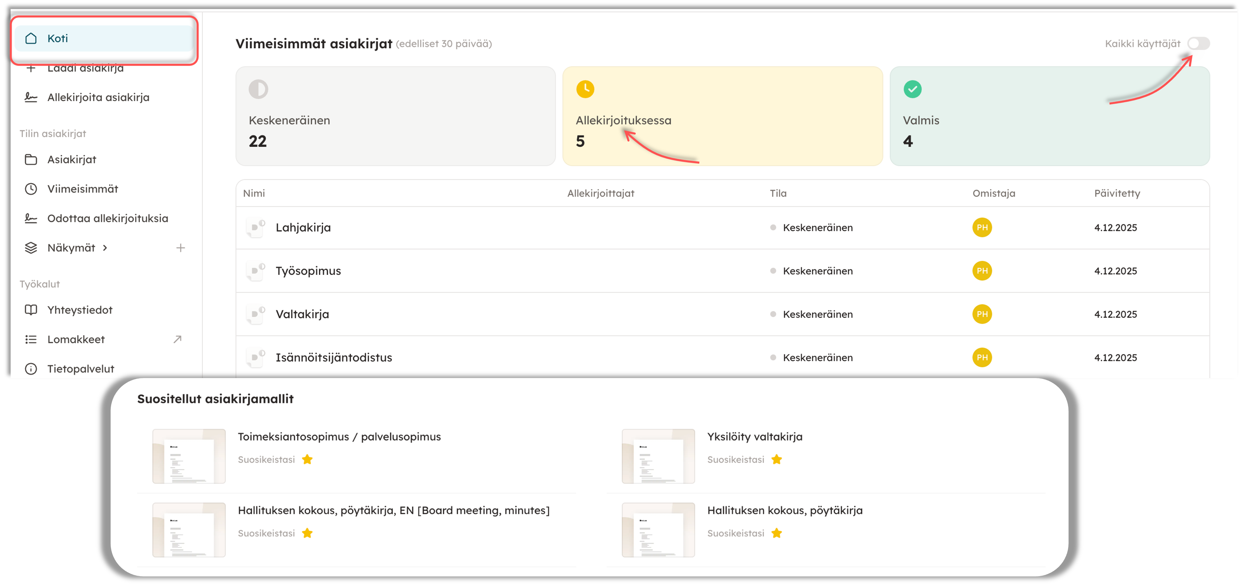 Oletuksena Kotinäytöllä näkyvät tiedot sellaisista asiakirjoista, joissa olet itse omistajana. Pystyt muuttamaan tämän myös kaikkien käyttäjien asiakirjoiksi klikkaamalla oikealla olevaa yläkulmaa. (Huom! Sinulla tulee olla oikeudet kyseisiin asiakirjoihin, jotta näet ne).