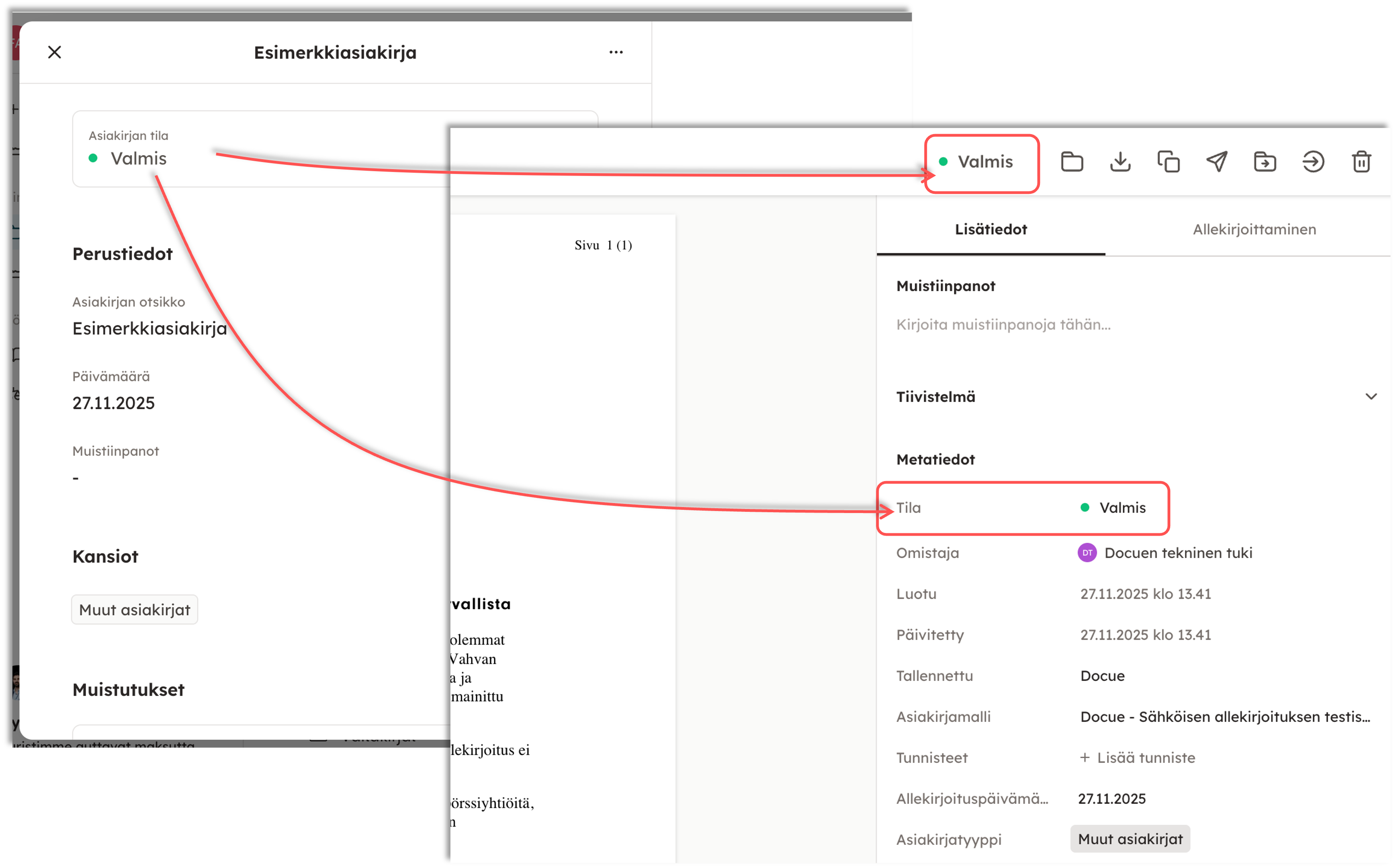 Asiakirjan tila on nähtävissä kahdessa kohdassa, yläpalkissa, sekä "Metatiedoissa".