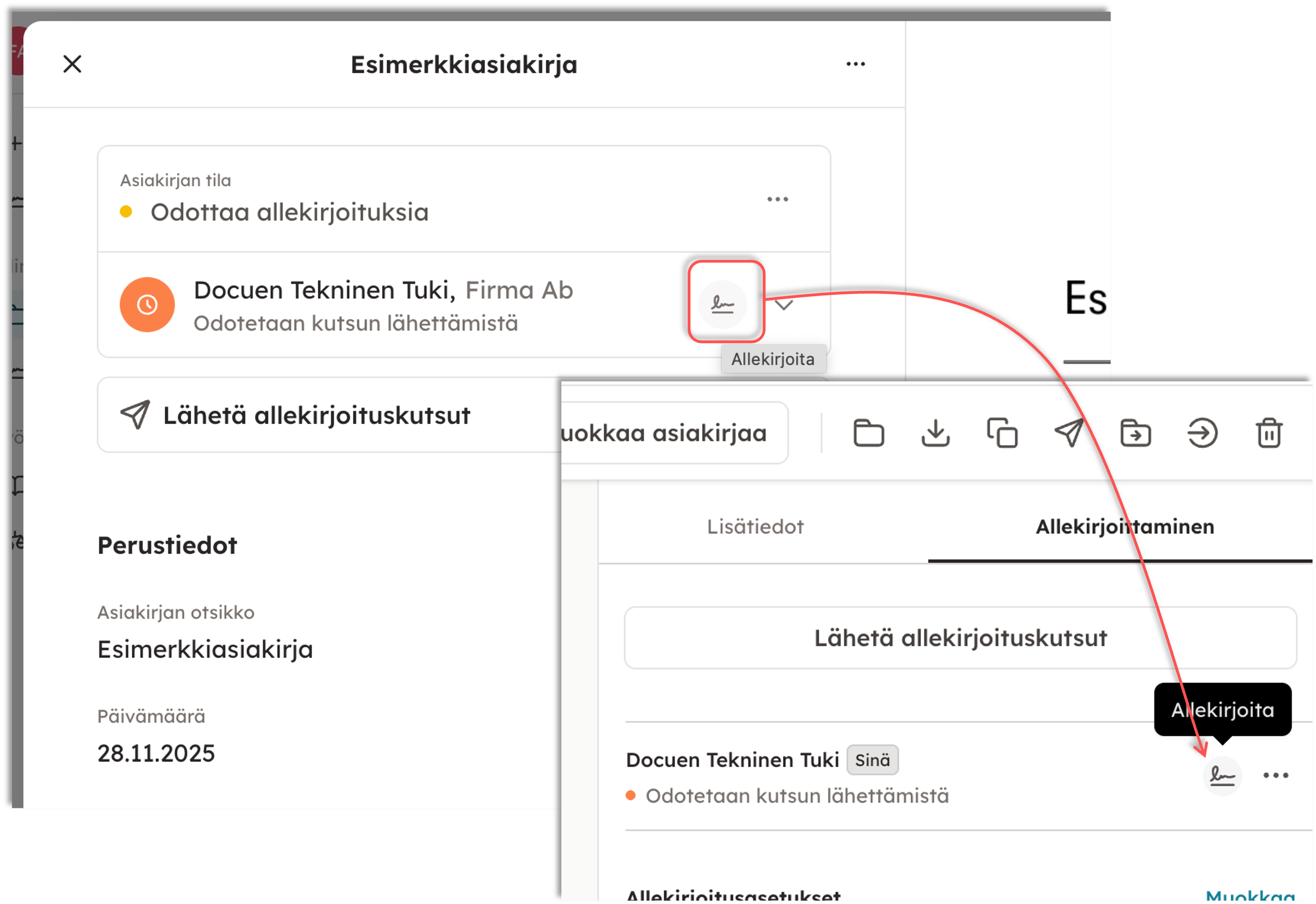 DocueDrivessa allekirjoittajan tiedot löytyvät pdf-näkymästä oikealta kohdasta "Allekirjoittaminen". Tästä näkymästä pääset tarkistamaan, milloin osapuolet ovat allekirjoittaneet, lähettämään allekirjoitusmuistutuksia, sekä allekirjoittamaan itse asiakirjan, mikäli olet siinä osapuolena.